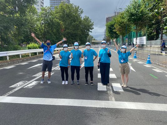 参加にあたって学生たちは、競技実施日までの2週間にわたって検温や健康チェックを行ったほか、多くの学生が札幌キャンパスで新型コロナウイルスワクチンの接種を受けて参加。両日とも3チームに分かれてコースの各ポイントに配属され、会場の設営やレース中の沿道整理などの業務を担当しました。10km地点で警備にあたった黒野春華さん(4年次生)は、「オリンピックのボランティアはなかなか経験できるものではないですし、コロナ禍での運営のあり方を知りたいと思い参加しました。昨年度から遠隔授業が続き同級生や後輩とも会えていなかったので、イベント運営のためにみんなで協力する喜びを実感しました。学外の人とコミュニケーションをとったり、予定が変わった場合は臨機応変に対応したりと、自分の成長につながる経験ができたと思います」と振り返りました。授業を担当する植田俊講師は、「本学科には部活動に取り組む学生も多いので、世界のトップクラスの選手たちの息づかいや足音などを肌で感じることで刺激を受け、“自分も競技で結果を残せるよう頑張りたい”“今すぐ運動したい”といった声が多く聞かれました。オリンピックのようなメガスポーツイベントに携われる機会は貴重だと思うので、この経験を今後の大学生活にも生かしてほしい」と期待を寄せました。