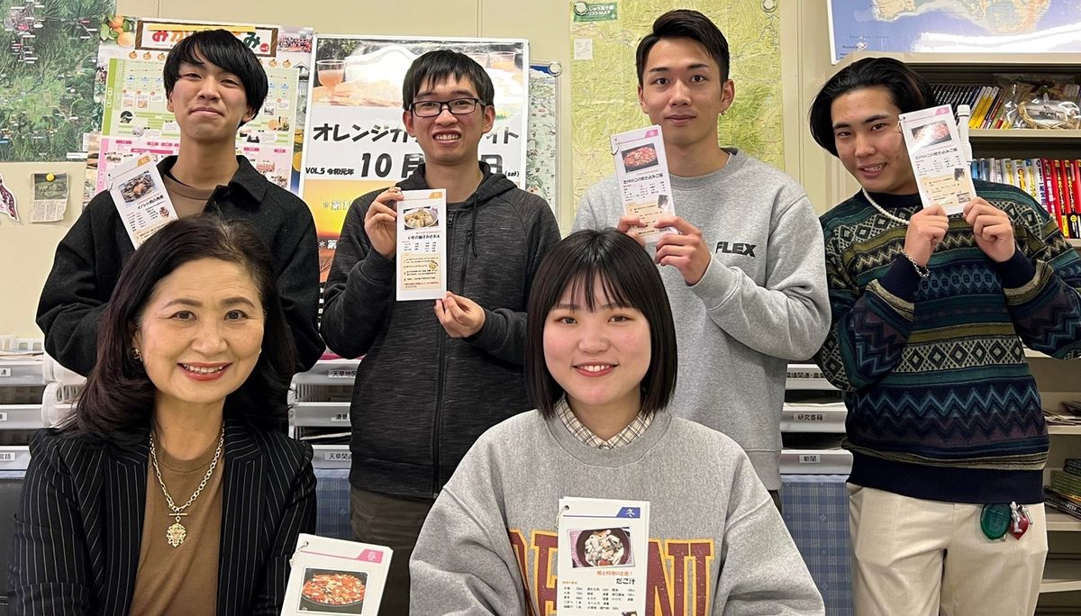 経営学部観光ビジネス学科の小林寛子教授のゼミ(エコツーリズム研究室)ではこのほど、熊本市西区河内町芳野地区に伝わる伝統料理のレシピカードを作成しました。小林ゼミでは、2013年度から同地区で観光資源調査やイベントの企画・運営を行っており、高齢化や過疎化が進む同町芳野校区の活性化を目指し、15年度から毎年「オレンジカクテルナイト」と題したイベントを開くなど、地域住民との交流を重ねてきました。レシピカードの制作は、同地区の郷土料理を後世に残そうと、小林教授とゼミ生たちが発案。昨年度から同地区在住で“食の名人”として知られる杉本純子さんの協力を得て、学生たちが季節ごとに取材に訪れ、作り方を記録するとともに写真撮影を続けてきました。