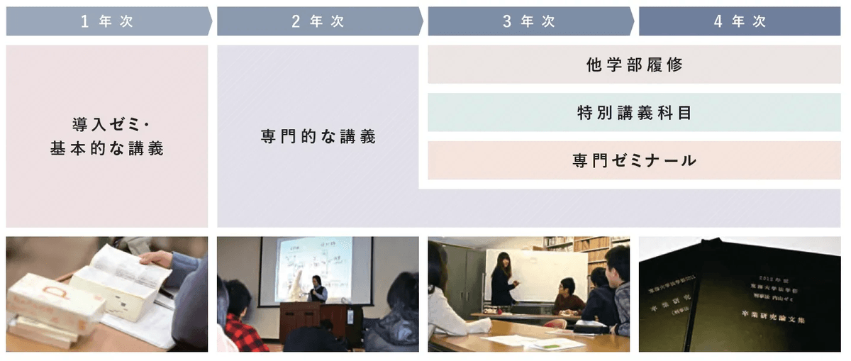 法学部に入学した皆さんには、一人ずつに指導教員がつきます。指導教員からは、入門ゼミナールで、情報収集の方法や条文の読み方など、法学部で学習するに当たっての基礎的事項を教わります。それだけでなく、毎学期の開始時には、指導教員と学生との個別面談があり、成績表を見ながら、前学期の振り返りと、学期の履修計画の相談などを行い、必要に応じて保護者とも連絡を取ります。大学生活で生じた悩みや将来の進路に関する相談などにも応じ、関係する機関の紹介なども行います。4年間を通じて同じ指導教員が一貫した学習指導を行うことで、皆さんが安心して大学生活を送れるための支援が可能となります。