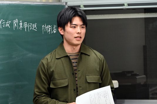法学部法律学科では12月12日に湘南キャンパスで、2024年度の公務員試験合格報告会を開催しました。公務員試験合格を目指す2、3年次生に向けて今年度の試験に合格を果たした4年次生が勉強法や面接といった試験対策を伝えようと毎年実施しているものです。今回は10名が出席し、防衛省(防衛装備庁)に採用が決まった二ノ宮琉さんと、葛飾区に採用が決まった山口雄大さんが登壇しました。