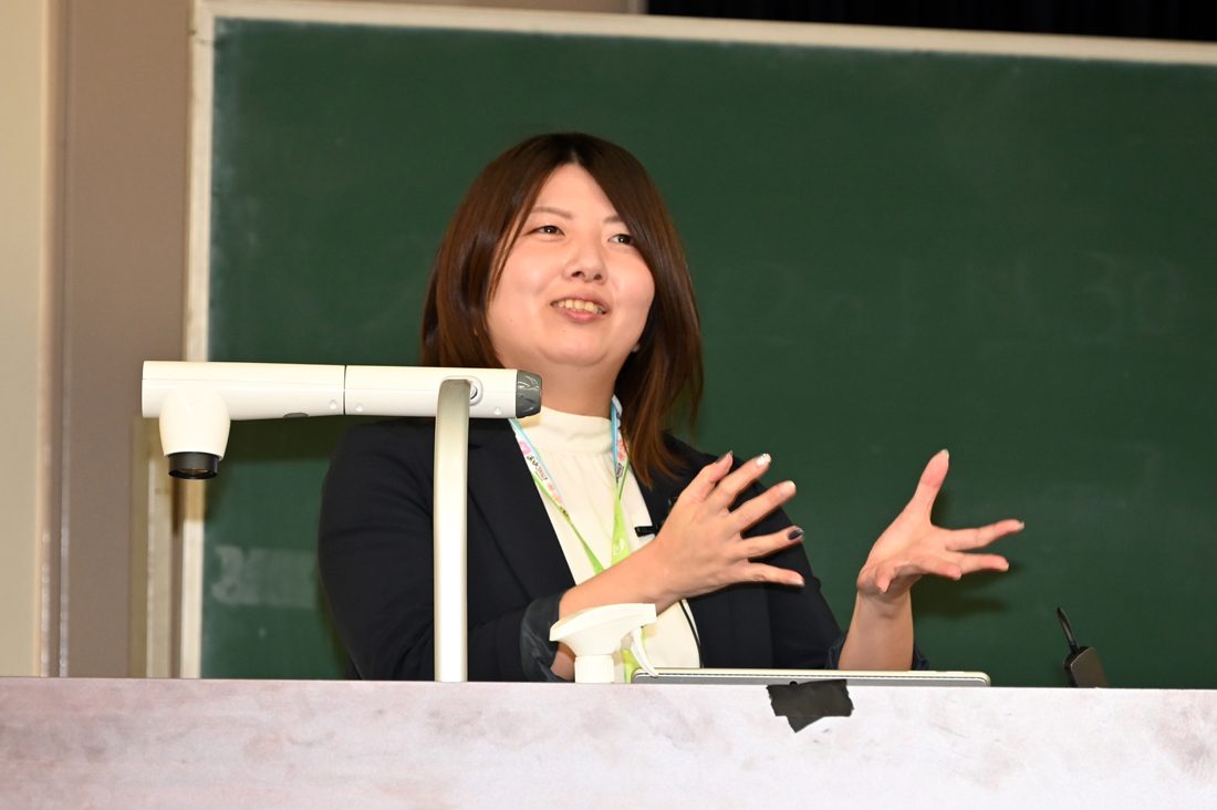 また、総務部職員課の高田亜矢子主事は、「厚木市役所の職員採用について」と題し、公務員の仕事の概略をはじめ、その魅力、市役所の各部署における役割、求める職員像などを紹介。採用試験のスケジュールを示しながら、「厚木市役所職員では出身大学別で最多となる110名の東海大学卒業生が在籍しています。採用試験に関する情報はSNSで公開しているので、志望される学生の皆さんは情報を漏らさずチェックしてください」と呼びかけました。