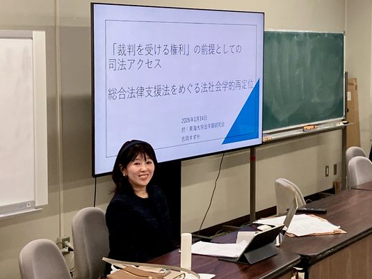 本発表は、司法アクセスを専門に研究してきた吉岡教授による最近の研究成果の一部を紹介するもので、裁判を受ける権利を抽象的な法規範としてではなく、裁判に至る以前の段階における情報取得や相談行動、制度との接続といった社会的・制度的過程から捉え直す視点が示されました。とりわけ、総合法律支援法の役割を法社会学の観点から再検討する点に、本報告の特徴があります。
