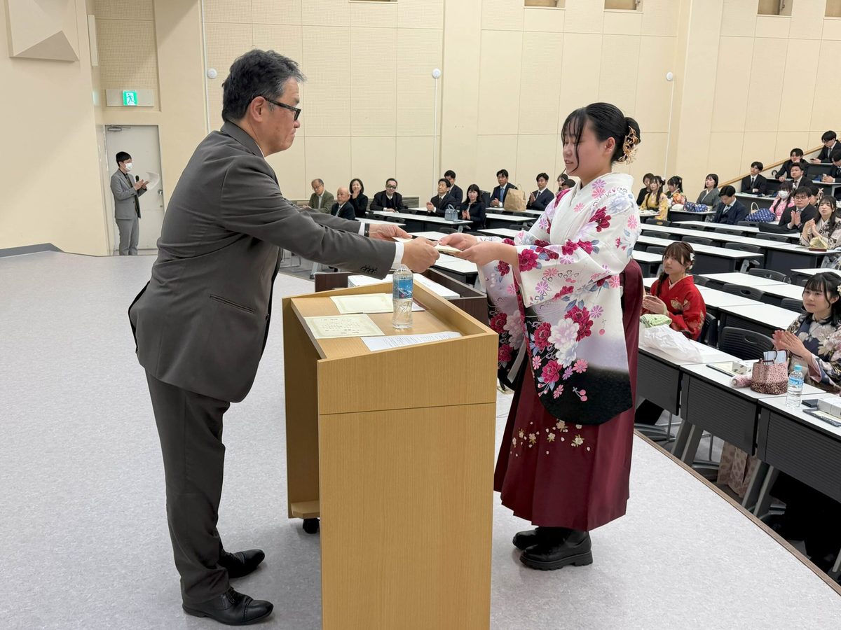 冒頭、唐津学部長からの祝辞では、卒業後はカスタマー(消費者)からサプライヤー(供給者)になること、少子高齢化によって労働力・カスタマーが減少していく中で、各自が専門知識を研鑽し、人的ネットワークを構築していくことの大切さを語りました。