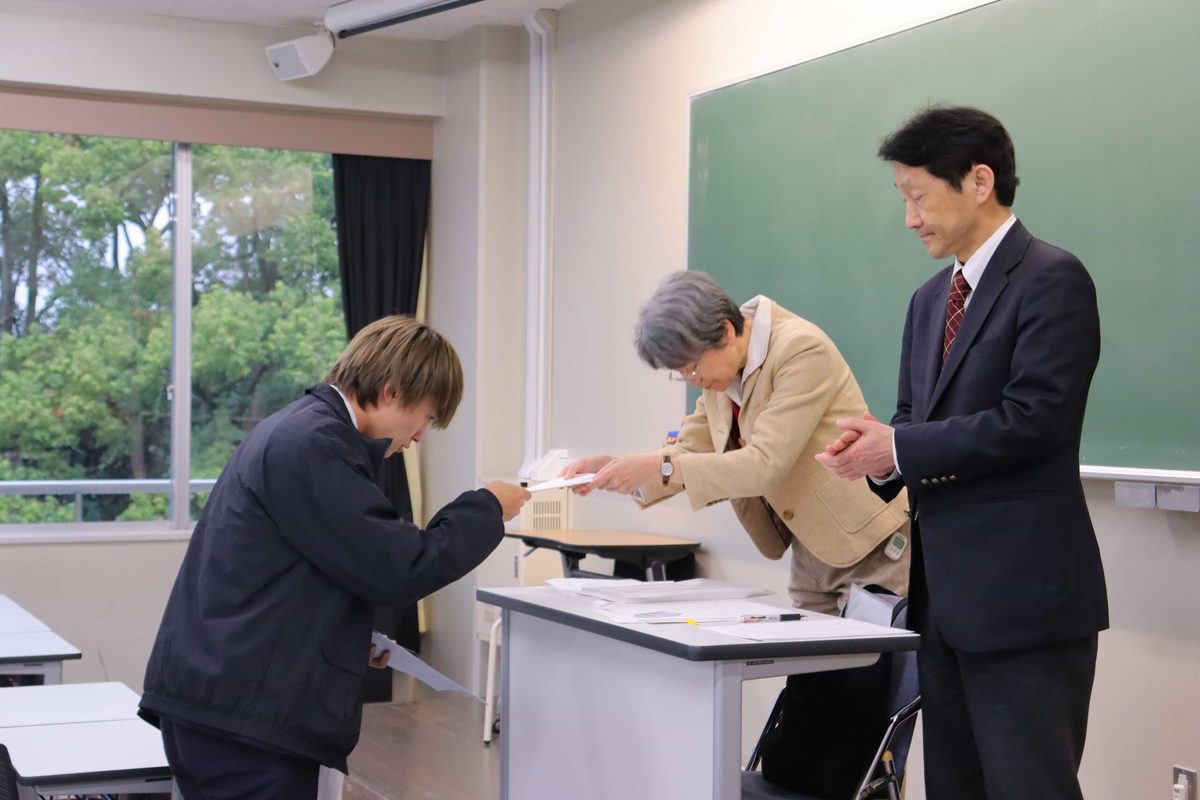それぞれ木村学長から表彰状が授与され、唐津恵一法学部長から記念品が贈呈されました。