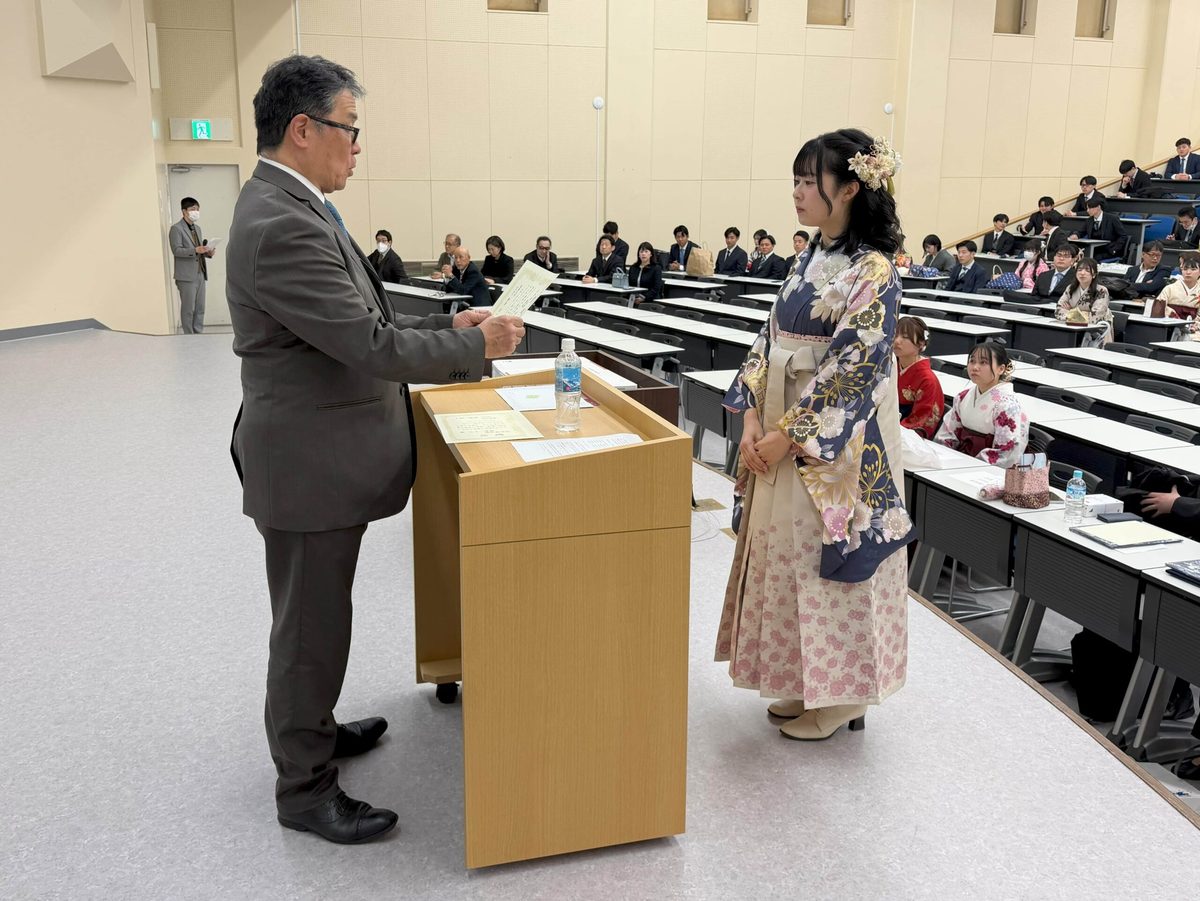 祝辞の後、足利惇氏賞受賞者である秋山望愛梨さんと法学部長賞受賞者6名に、唐津学部長から表彰状が授与されました。