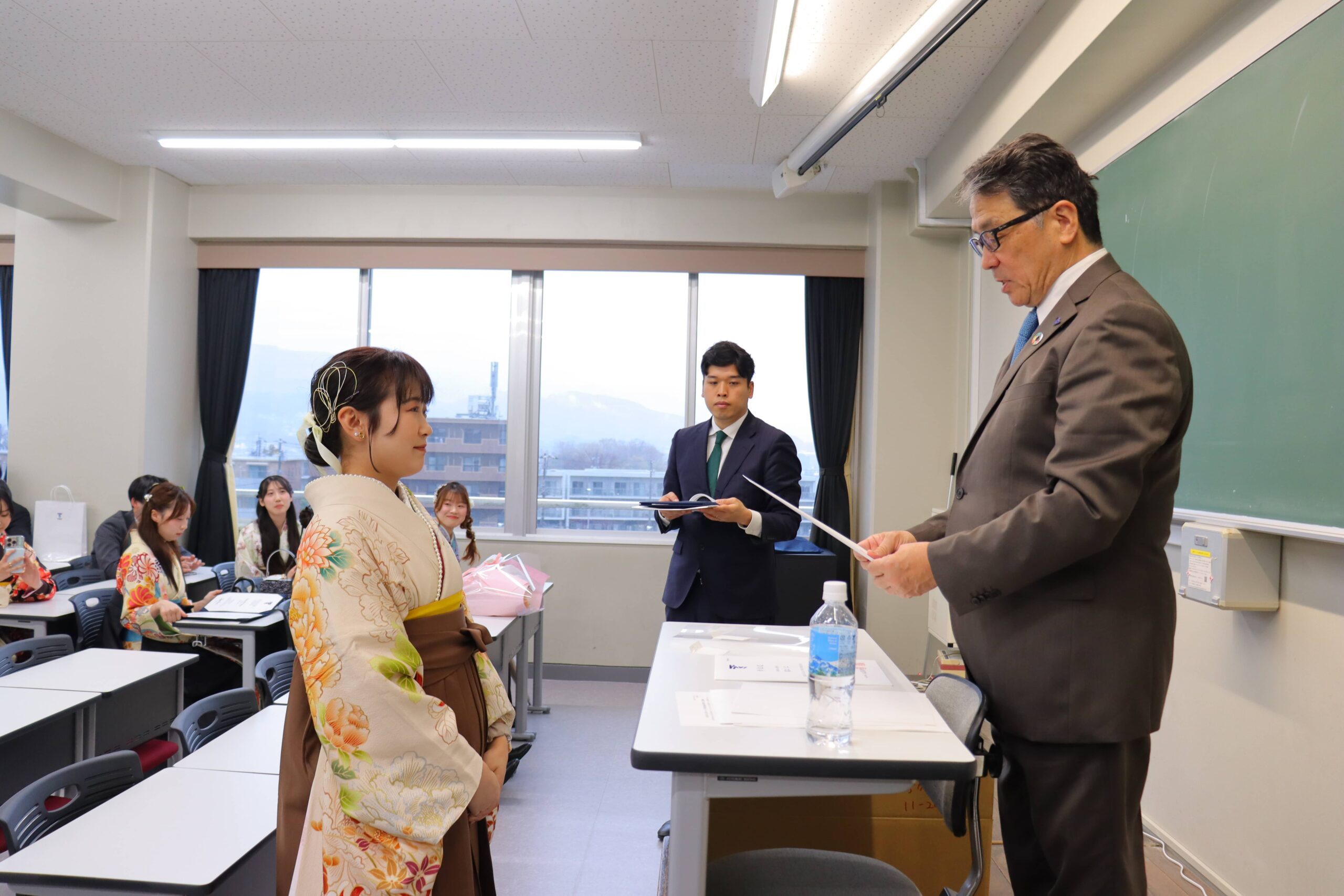 それぞれ木村学長から表彰状が授与され、唐津恵一法学部長から記念品が贈呈されました。