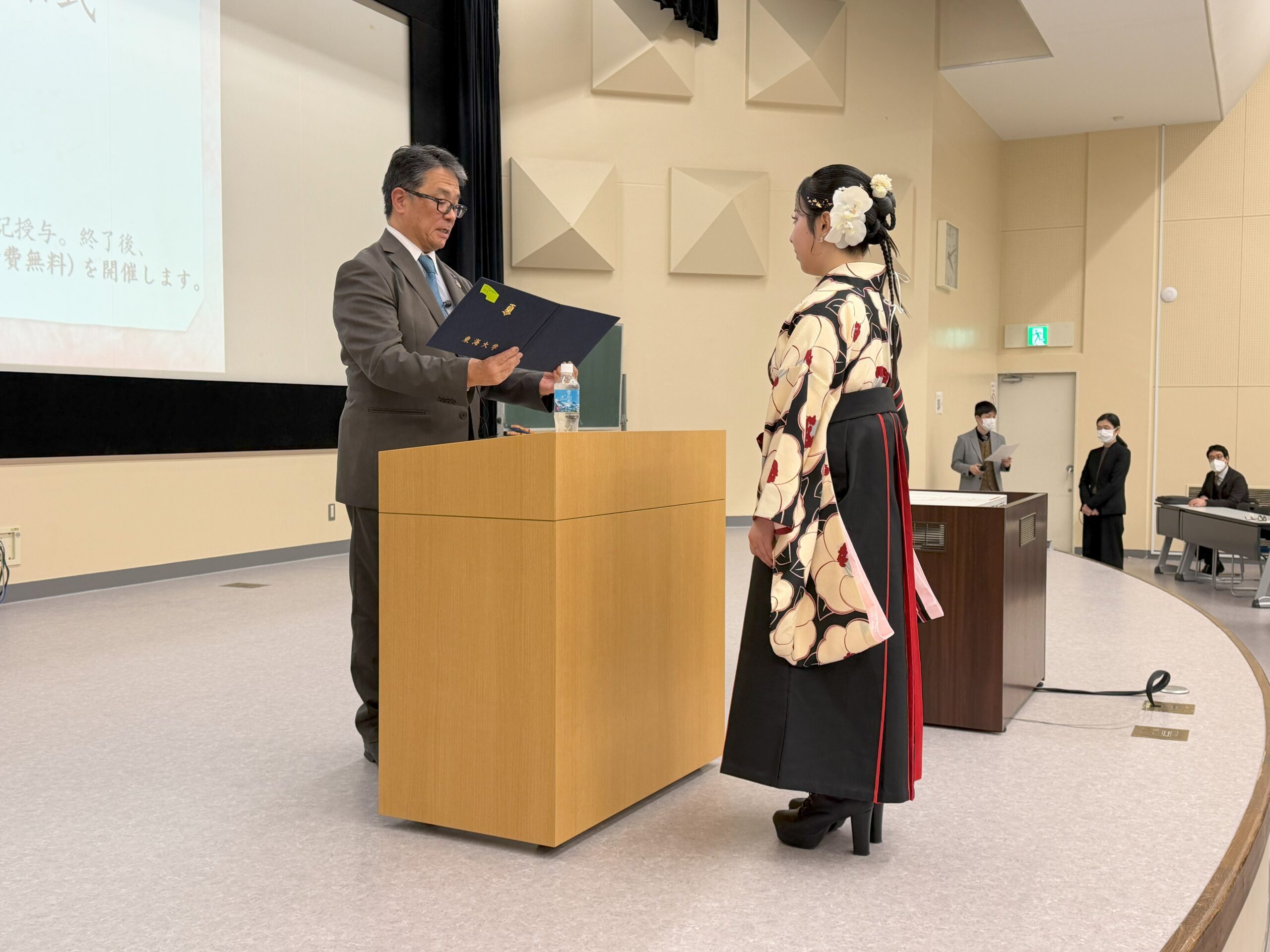 その後、5つのクラスに分かれて学位記授与がおこなわれ、最後に8号館食堂で行った卒業祝賀会で別れを惜しみました。