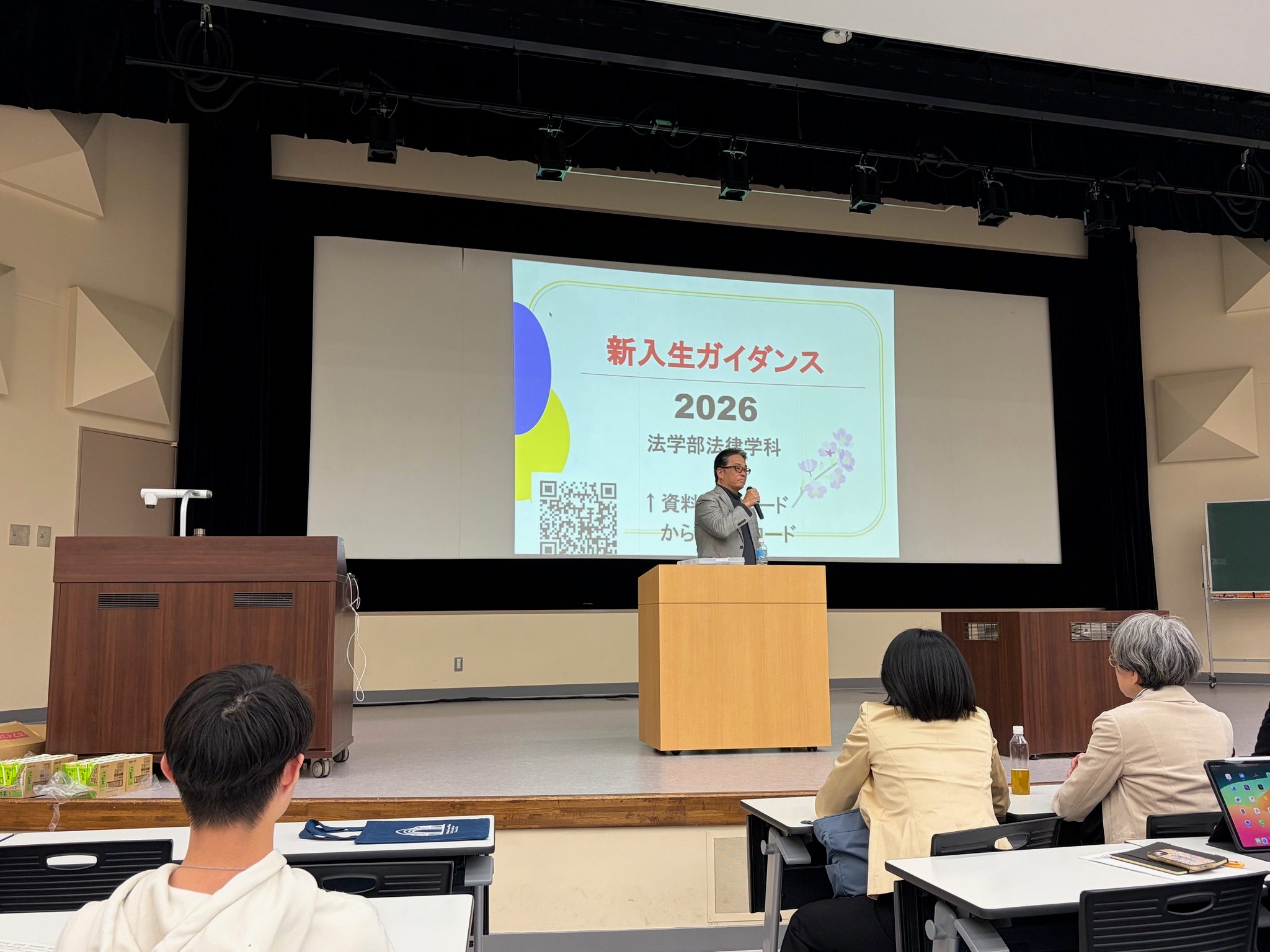 大学における学びと生活は高校までとは異なり、選択の自由が大きく広がる一方、その前提として自己規律に基づく主体的な行動が求められることが示されました。また、新設される法律特修コースの意義と特色について紹介がなされ、専門的な学びへの期待が示されました。さらに、学生生活を通じて学生同士のネットワークを築くことの重要性が語られ、新入生への激励の言葉が贈られました。