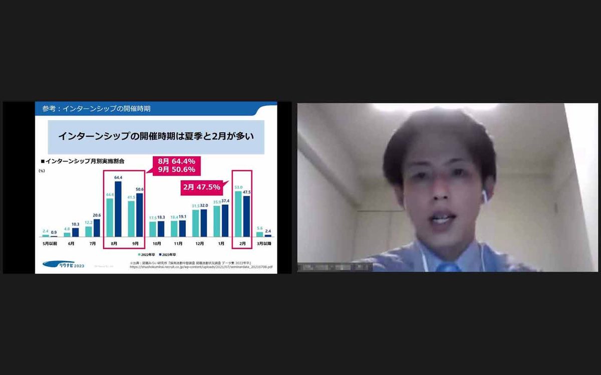 キャリアサポーターは、「新型コロナウイルス感染症拡大により、新卒採用計画を小規模で行う企業もでてきていますが、求人倍率はそれほど落ち込んではいません。また、最終面接をWEBで実施する企業が4割に上るなど、企業はWEBでの取り組みを強化しています。WEB化していく流れにしっかりと対応し、オンラインでのコミュニケーションに慣れるようにしてください。インターンシップの開催時期は夏季に多いイメージですが、毎年2月には多くの企業が開催しています。より採用活動に寄った内容になっているので、積極的に参加してください」と話しました。