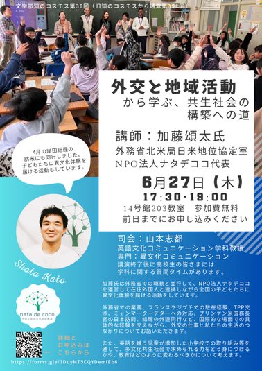 英語文化コミュニケーション学科の山本志都教授が企画した2024年度知のコスモス企画「外交と地域活動から学ぶ、共生社会の構築への道」が、6月27日(木)に開催されます。