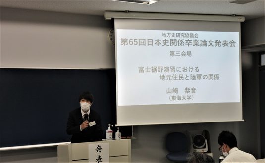 大学院博士課程前期1年次の山崎紫音さん(以下、山崎さん)が、地方史研究協議会の第65回日本史関係卒業論文発表会で、「富士裾野演習場における地元住民と陸軍の関係―明治末期から昭和前期を対象に―」を発表しました。