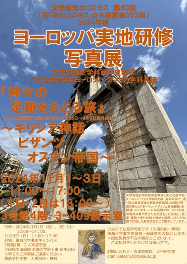 文学部歴史学科西洋史専攻、文化社会学部ヨーロッパ・アメリカ学科では、2024年11月1日(金)~3日(日)に「知のコスモス」展示会「ヨーロッパ実地研修写真展」を開催します。文学部歴史学科西洋史専攻と文化社会学部ヨーロッパ・アメリカ学科では、毎年共同で、週1回の教室授業と夏季休暇期間での海外研修を併せた「ヨーロッパ・アメリカ実地研修」を開講しています。この写真展では、2024年度の海外研修『神々の足跡をたどる旅~ギリシア神話 ビザンツ オスマン帝国~』(8月28日~9月9日)で学生たちが撮影した写真と、授業・書籍で得た知識+現地で実際に学んだ知識で作成した解説文を付して展示しています。どなたでも、予約不要・無料でご覧になれる展示です。ご来場をお待ちしています。