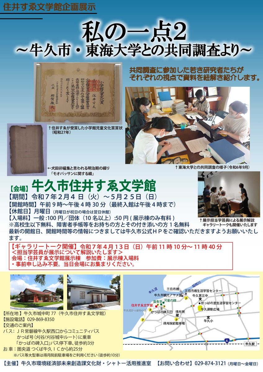 また、2024年2月から5月にかけては、牛久市住井すゑ文学館で企画展「私の一点 ~牛久市・東海大学の共同調査より~」が開かれました(好評につき7月まで延長)。