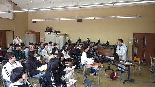 勝坂遺跡では、ボランティアの方から遺跡と地域住民とのつながりについてお話をうかがいました。屋外での説明でしたが、新入生のみなさんは真剣に耳を傾けていました。