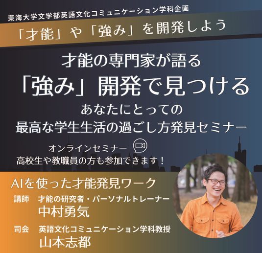 本企画は異文化コミュニケーションを専門とする山本志都教授が企画・運営のもと、才能研究者であり、ストレングスファインダー®認定コーチの中村勇気氏を講師に迎え実現したものです。