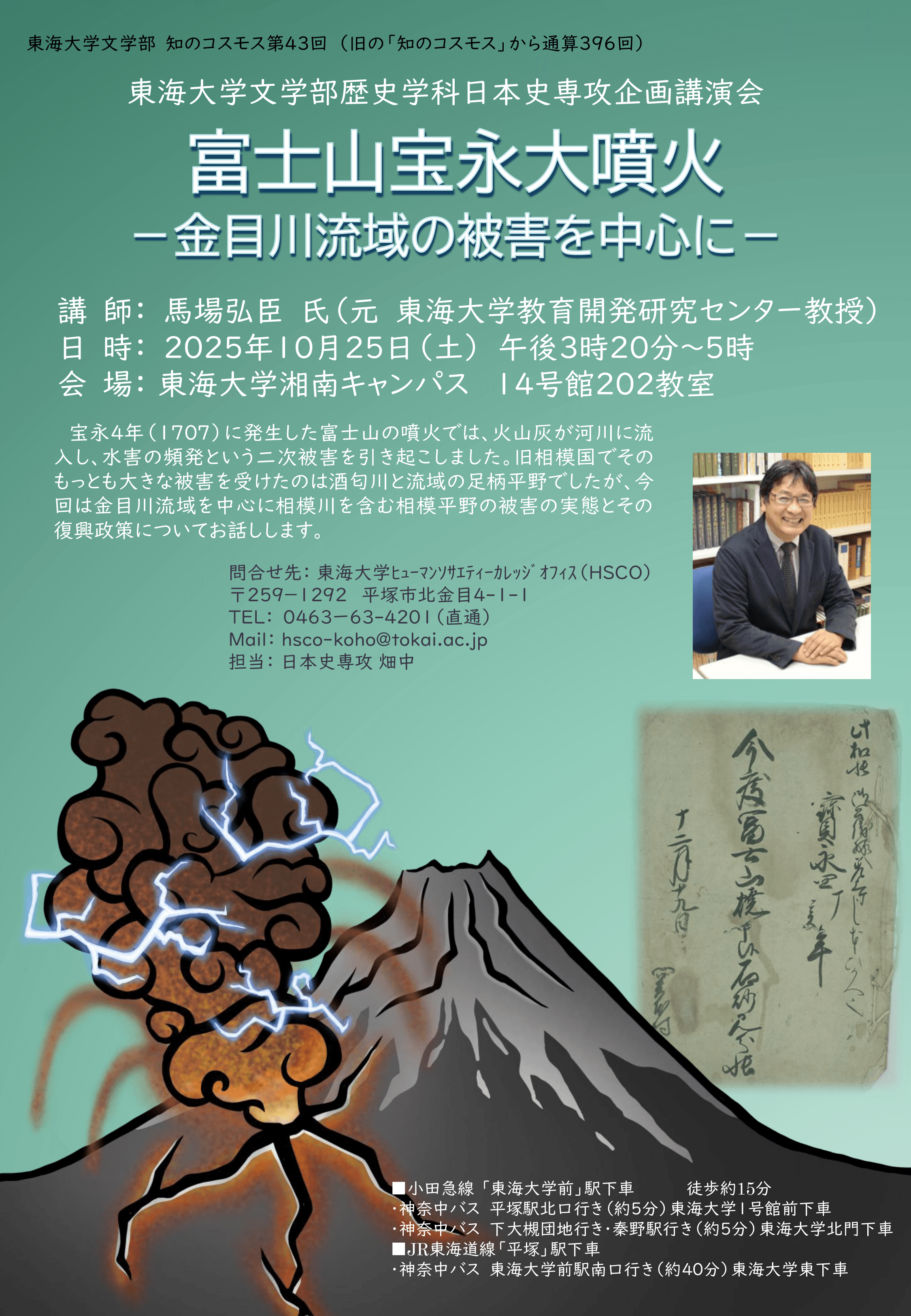 今年度は、昨年3月に東海大学教育開発研究センターを退任された馬場弘臣氏を講師としてお迎えし「富士山宝永大噴火―金目川流域の被害を中心に―」というテーマで講演致します。