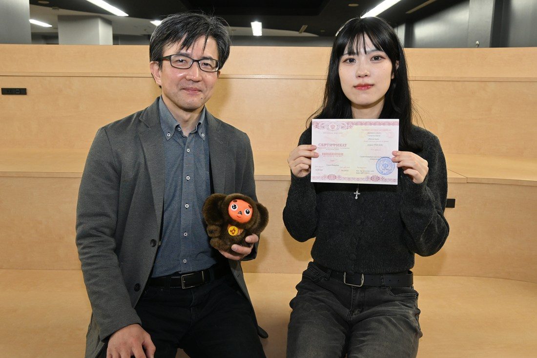 西村さんは2023年10月から24年8月までベラルーシのミンスク言語大学に留学。ロシア語圏の文化や語学について学び、期間中には、ロシアの大学への出願条件となる同試験の第1レベルに合格しました。帰国後は語学教育センターの古賀義顕准教授と週1回のオンライン勉強会を通じて第2レベルの試験勉強に取り組み、今年2月に筆記試験に合格したもののリスニング試験で不合格に。7月に再試験を受けて、11月に合格が認められました。