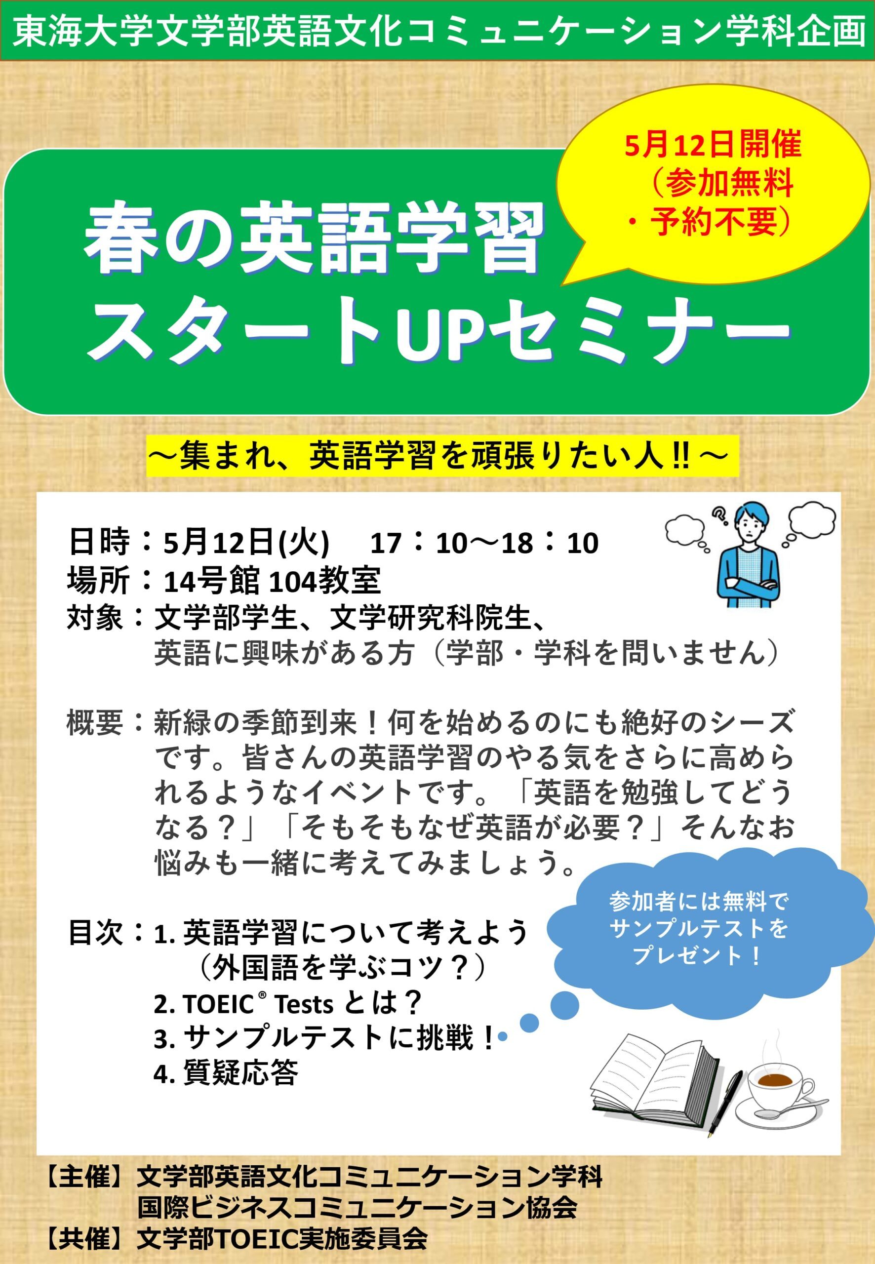 この度、文学部英語文化コミュニケーション学科・国際ビジネスコミュニケーション協会主催で「春の英語学習スタートUPセミナー」を実施致します。