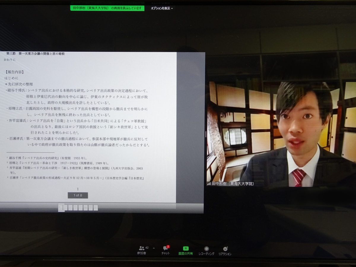大学院史学専攻の博士前期課程2年の田中那樹さんが、2021年5月1日(土)にリモート形式(Zoom)で開催された、地方史研究協議会の第61回日本史関係卒業論文発表会において、「シベリア出兵・撤兵政策と原敬」と題して発表しました。田中さんの卒業論文の指導教員は、本専攻の山本和重先生(近現代史)です。