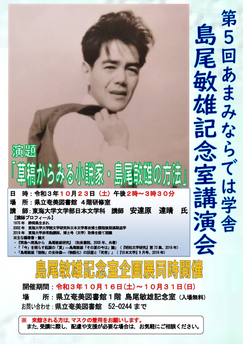 安達原達晴講師が10月23日に鹿児島県立奄美図書館にて講演しました。講演は例年、同館の前身である鹿児島県立図書館奄美分館の初代館長を務めた作家・島尾敏雄に関わる研究者等を招き、同館の生涯学習講座「あまみならでは学舎」の一環として開催されます。