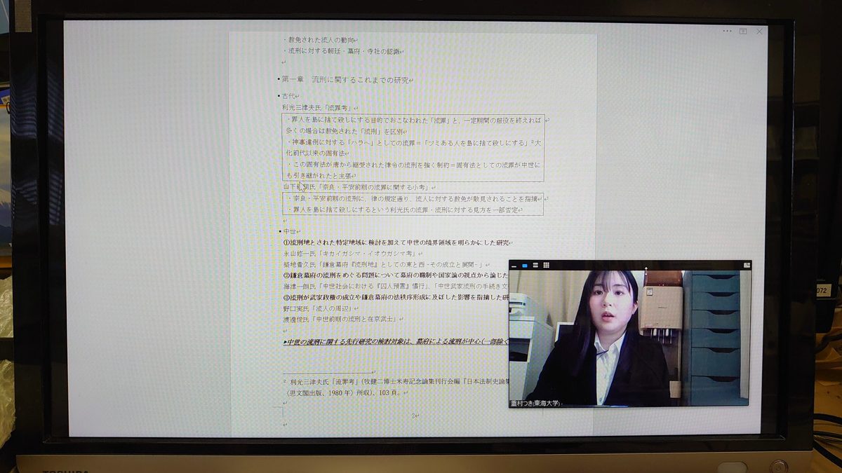 この春、文学部歴史学科日本史専攻を卒業し、東海大学大学院文学研究科史学専攻博士課程前期に進学した重村つきさんが、2022年4月16日(土)にリモート形式(Zoom)で開催された第63回日本史関係卒業論文発表会で、「流刑からみた中世国家」と題した発表をおこないました。。