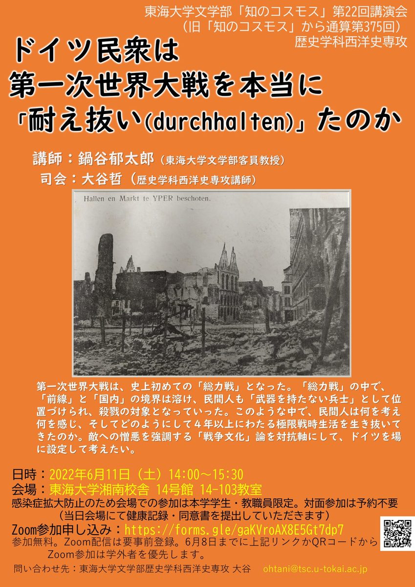 文学部歴史学科西洋史専攻では6月11日(土)に文学部「知のコスモス」講演会「ドイツ民衆は第一次世界大戦を本当に「耐え抜い(durchhalten)」たのか」を開催します。