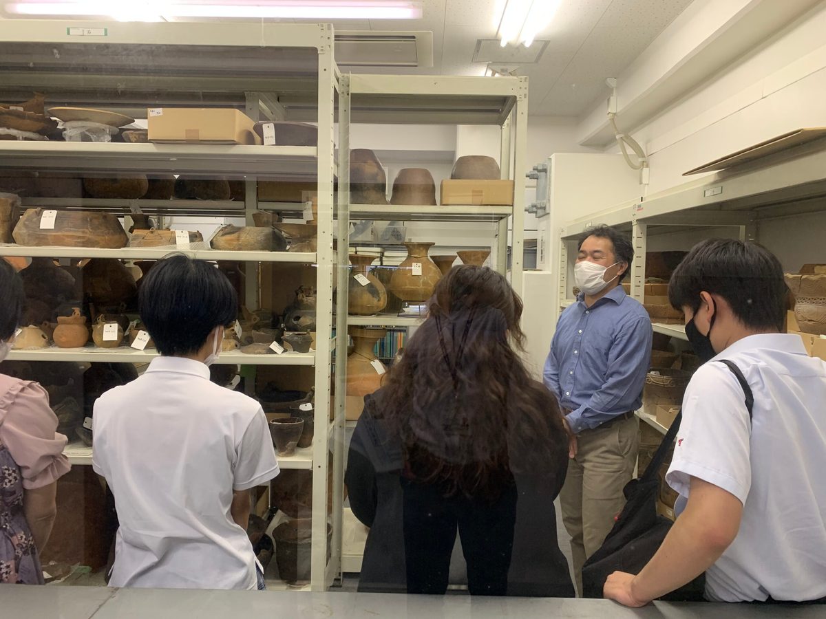 本学所蔵の古代エジプトコレクション、文学部歴史学科考古学専攻が保管している土器、文化社会学部広報メディア学科のスタジオ、そして11号館の図書館見学を実施いたしました。