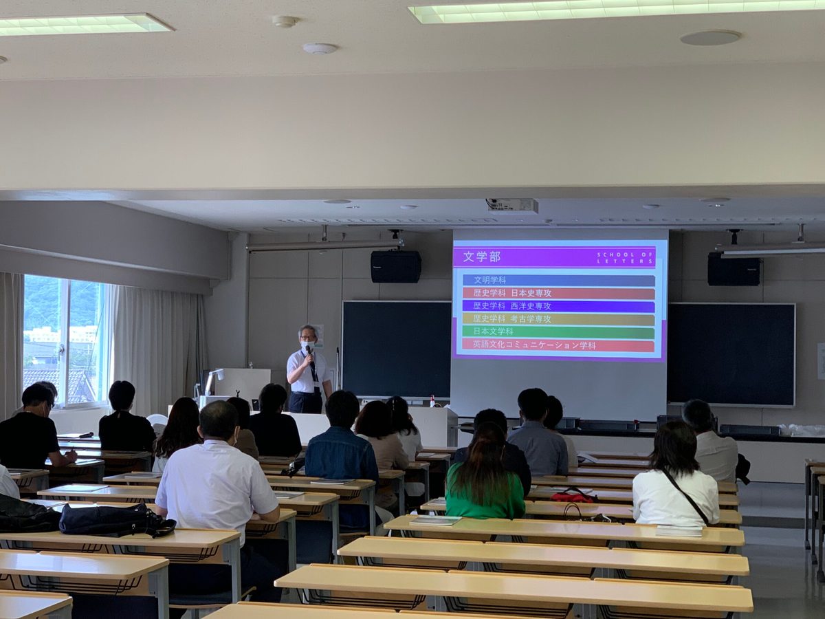 午前と午後あわせて約80名の保護者や高校生の皆様に参加いただき、15名ほどのグループに分かれて、それぞれの場所を巡りました。考古学実習室では、同専攻の宮原俊一准教授より、大学校地内遺跡やそこで発掘された土器、また埋葬時の土器の特徴などの説明がされました。見学者の皆さんからは多くの質問もあり、和やかなツアーとなりました。11号館図書館では普段は入室できない閉架室にて、希少本である豆本をご覧いただきました。今回のツアーでは、学部学科紹介の冊子では触れることができない品々や場所を実際に見て、触れていただこうと企画いたしました。引き続き、オープンキャンパス等でも文学部、文化社会学部の魅力をお伝えしてまいります。
