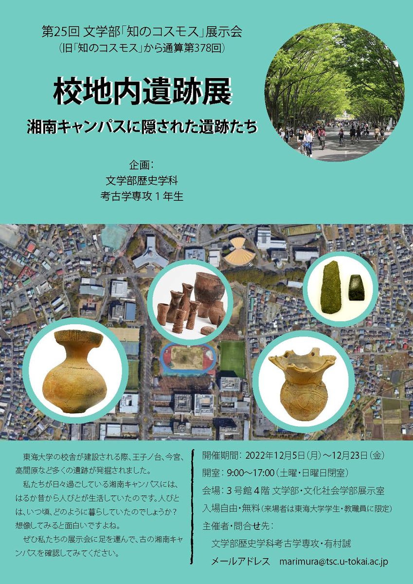 校地内遺跡調査団(秋田かな子・宮原俊一)と考古学専攻1年生の合同企画による特別展「校地内遺跡展―湘南キャンパスに隠され遺跡たち―」(第25回文学部「知のコスモス」展示会)を湘南キャンパス3号館4階の文学部・文化社会学部展示室で開催しています。会期は12月5日から12月23日(土日は閉室)まで。