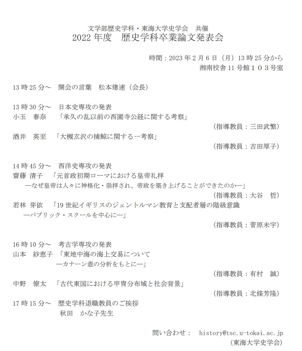 文学部歴史学科(日本史専攻・西洋史専攻・考古学専攻)では2023年2月6日(月)に、東海大学史学会と共催で「2022年度卒業論文発表会」を開催しました。各専攻から優秀卒業論文を2本選出し、執筆者に内容を発表してもらうものです。