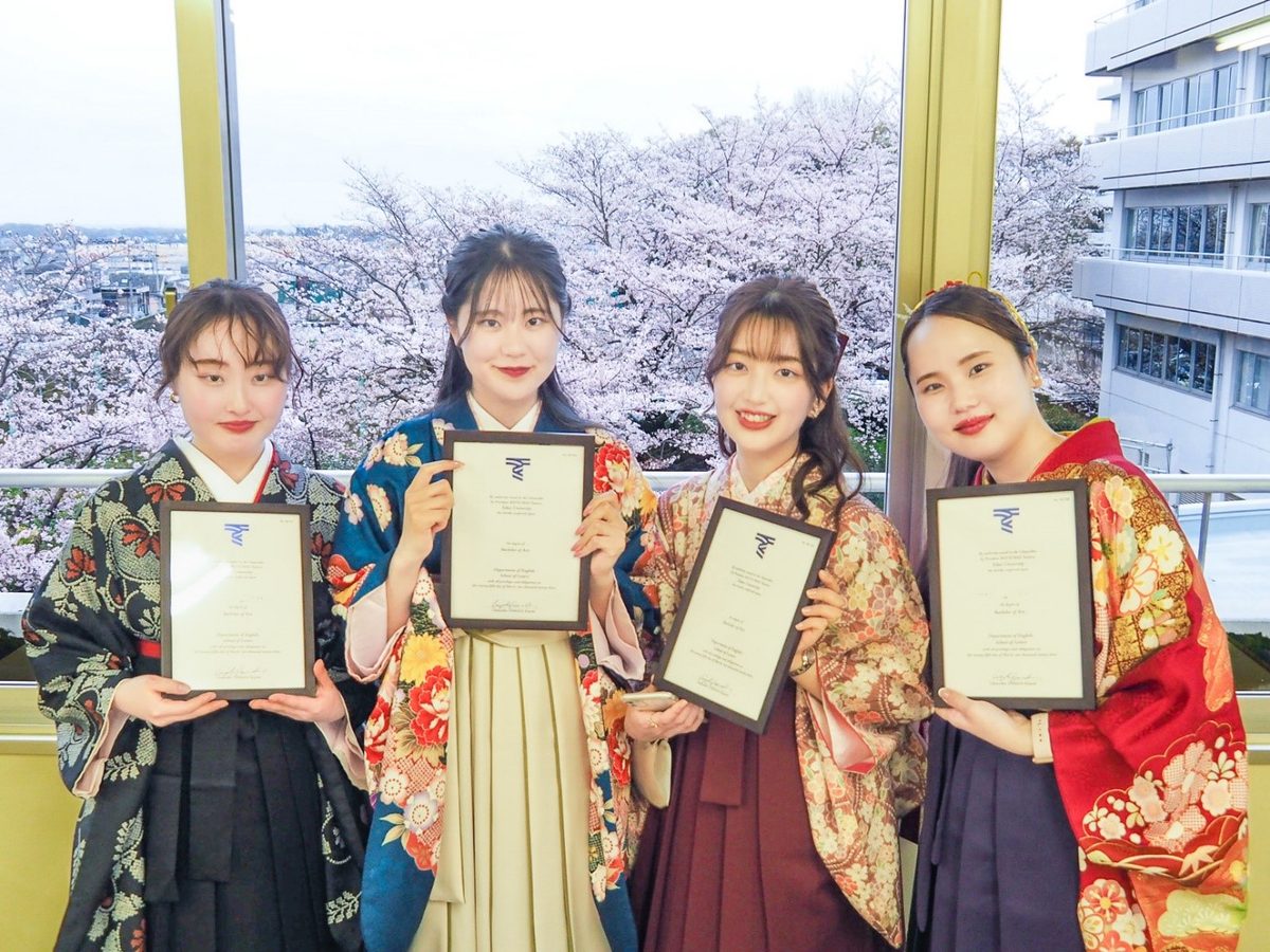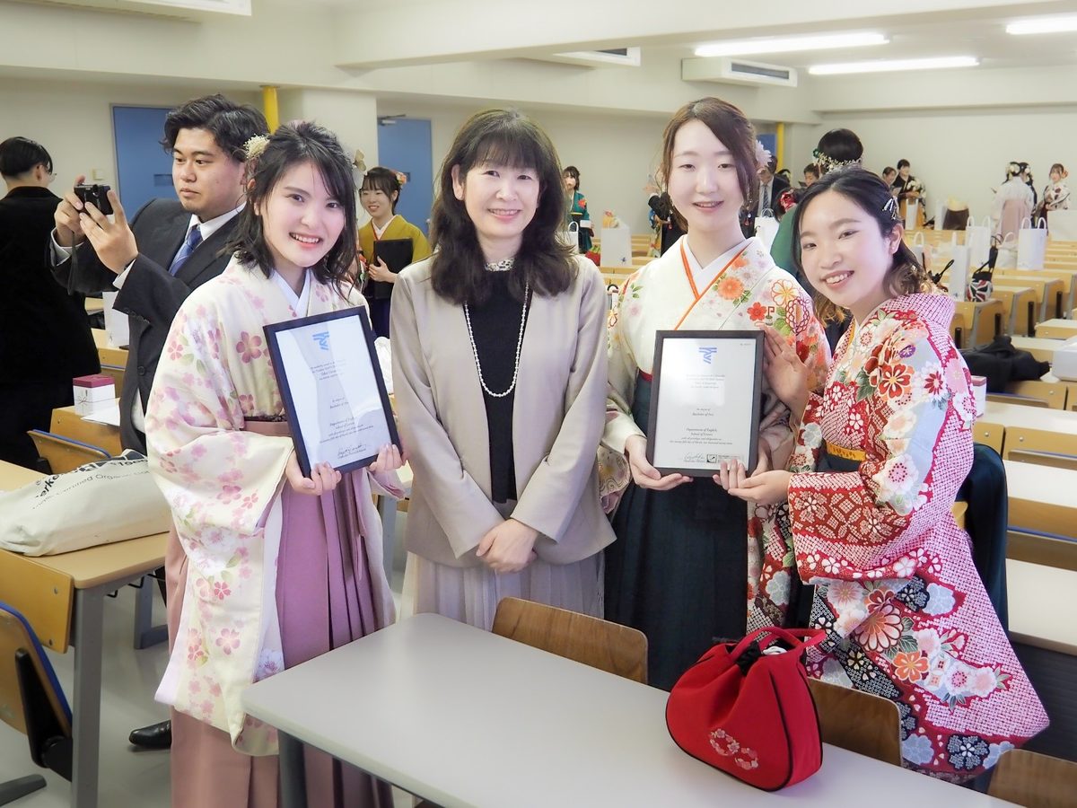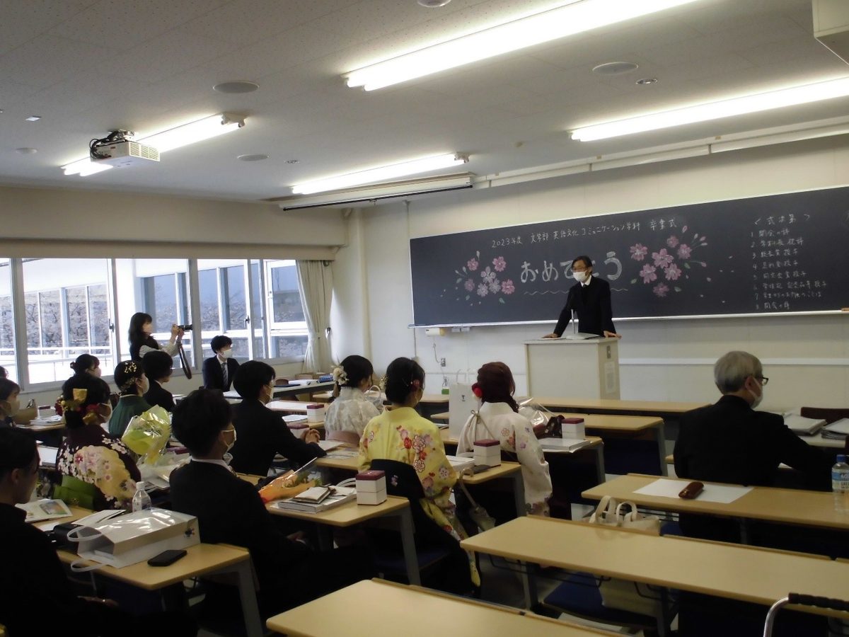 3月25日、14号館204教室において、2022年度英語文化コミュニケーション学科卒業生の学位授与式を執り行いました。桜満開となり、華やかな雰囲気の中、卒業生の皆さん一人ひとりに学位記が手渡されました。晴れ晴れとした皆さんの各々の表情の中にも新たな進路に向けた決意が感じられる姿がとても印象的でした。