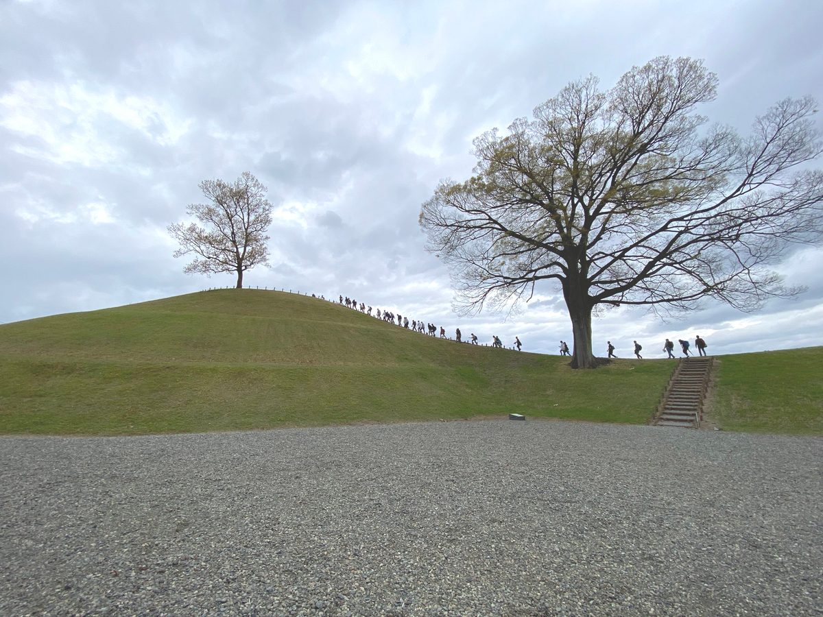 北條芳隆教授が計画した今回の研修会のテーマは、「甲斐の古墳と博物館を廻る」。とくに全長168mの規模を誇る甲斐銚子塚古墳の巨大さを1年生にも実感させつつ、文化財保護の実際を見せたいとの企画でした。博物館見学についても実物展示中心の考古博物館と、模型や映像イメージ展示主体の県立博物館との対照性を実体験させることが主眼でした。