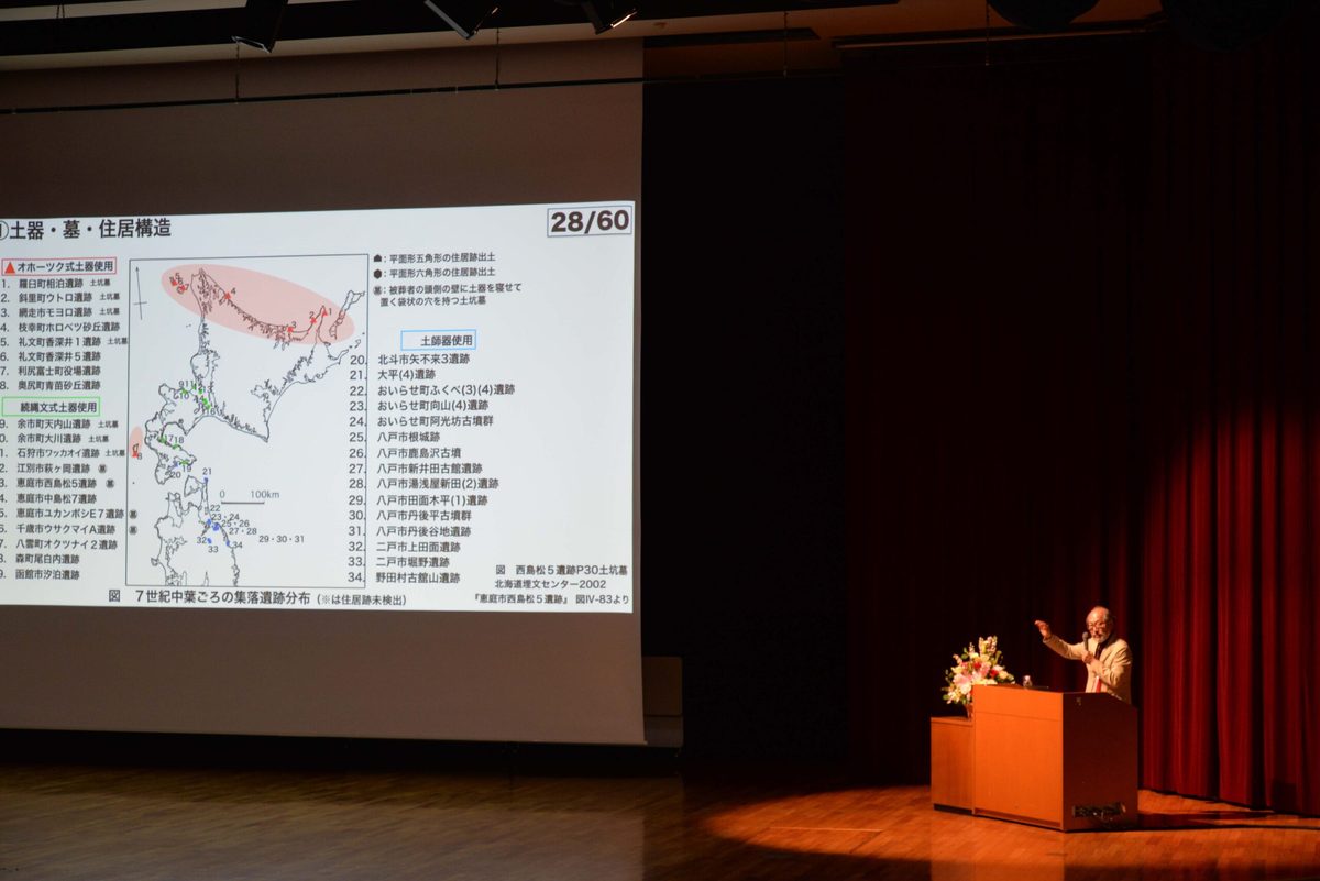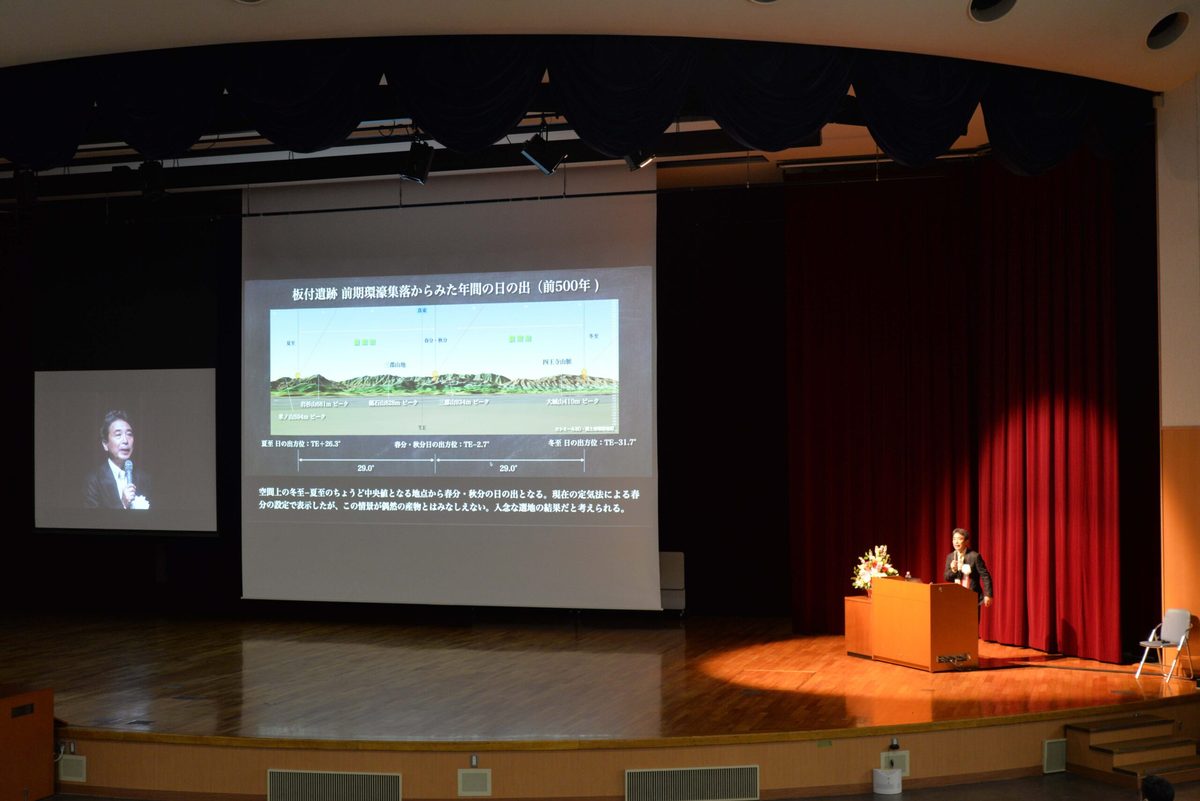 初日の午後には、公開記念講演が2号館大ホールにて行われました。講演では、本学考古学専攻の教授である北條芳隆先生と松本建速先生にご登壇いただきました。北條先生は古墳時代の専門家として数々の業績を残されていますが、最近では、太陽や月の運行と古代遺跡との関係を熱心に探求されており、「考古天文学」という日本ではまだなじみのない領域の開拓とその普及にいそしんでおられます。これまでの成果は『古墳の方位と太陽』(同成社)にまとめられていますが、今回の講演では、吉野ケ里遺跡などの遺跡で発見された遺構の軸線と太陽や月の運行との関係に焦点をあてた新たな研究成果が次々に披露されました。2人目の講演者である松本先生は、古代の移住や話されていた言葉の問題を探求してきました。特に、古代のエミシの問題に取り組んでおり、『蝦夷の考古学』『つくられたエミシ』(同成社)などの著作で、エミシの存在そのものに疑問を投げかけてきました。本講演でも、考古学的な証拠や文献資料を用いながら、エミシの存在を批判的に検討し、古代東北で何が起きていたのかを推察しました。お二人の講演に共通していたのは、現在進行形の研究内容と今後の研究の展望でした。長い研究者人生の総括的なお話ではなく、今後の目標を語る両講演者の姿勢がつよく印象に残りました。