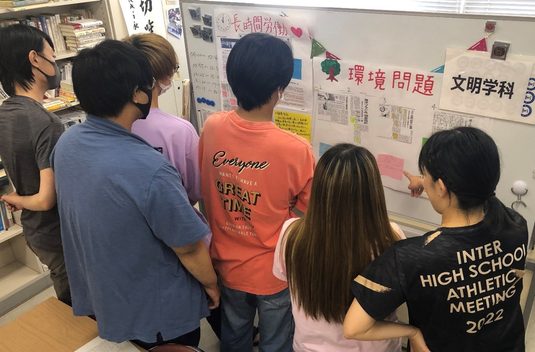 1年次対象の入門ゼミナールB(担当教員:李賢京)にて、「まわしよみ新聞」を制作しました。「まわしよみ新聞」とは、テーマに沿ってグループごとに(3-4人)、新聞記事を持ち寄り、その中でトップ記事を決め、編集後記を記し「まわしよみ新聞」として作成し、公表するものです。本年度はテーマを1年生自身に決めてもらい、「環境問題」と「長時間労働」の2つになりました。限られた短い時間の中でしたが、テーマに沿って、どの記事が一番良いか、それぞれ意見を言い合い、議論を重ね、しっかりと自分の言葉で発表することができました。「まわしよみ新聞」の制作を通じて、身の回りに起きている社会問題について具体的に考え、問題解決のために個々人でできることについて探る時間となりました。