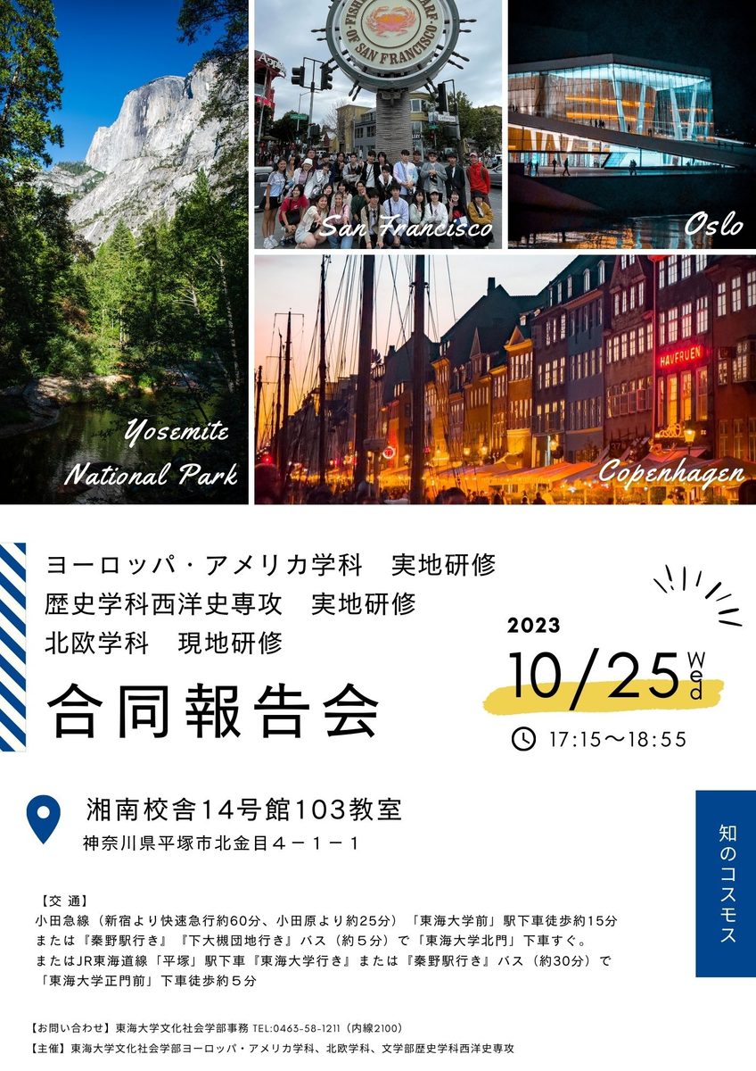 10月25日(水)17時15分~18時55分、文化社会学部と文学部合同で、夏にアメリカ合衆国および北欧(デンマーク・ノルウェー)を訪問した学生による研修の報告会を実施します。