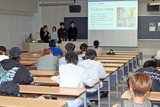 続いて北欧学科の柴山由理子講師が、学生5名と8月30日から9月11日までの13日間にわたってノルウェー(オスロ、西ノルウェーフィヨルド群、ベルゲン)、デンマーク(コペンハーゲン、ロスキレ、オーデンセ)にて実施した研修の様子を紹介。参加学生たちは、研修の狙いや春学期に行った現地研修事前演習の授業での様子を紹介した上で、公共建築物に福祉国家としての機能性が見られたことや、古い街並みと現代的建築物が融合していることなどの魅力を報告しました。また、フィヨルドで触れた自然環境や、各地の教会、アンデルセン博物館などを見学した感想、オスロ大学、ベルゲン大学、コペンハーゲン大学、望星国民高等学校など現地の教育・研究機関を訪問した成果を語り、「11月1日から3日までの建学祭で、現地研修の様子を紹介する写真展を開くので多くの方に研修の成果を見てもらいたい」と話しました。