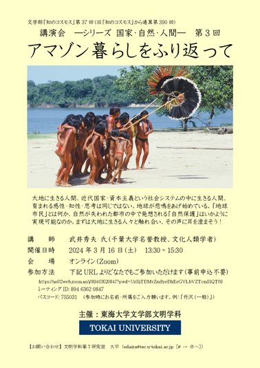 文学部文明学科では、3月16日(土)に、オンライン(Zoom)で、講演会 ―シリーズ 国家・自然・人間― 第3回「アマゾン暮らしをふり返って」を開催します。