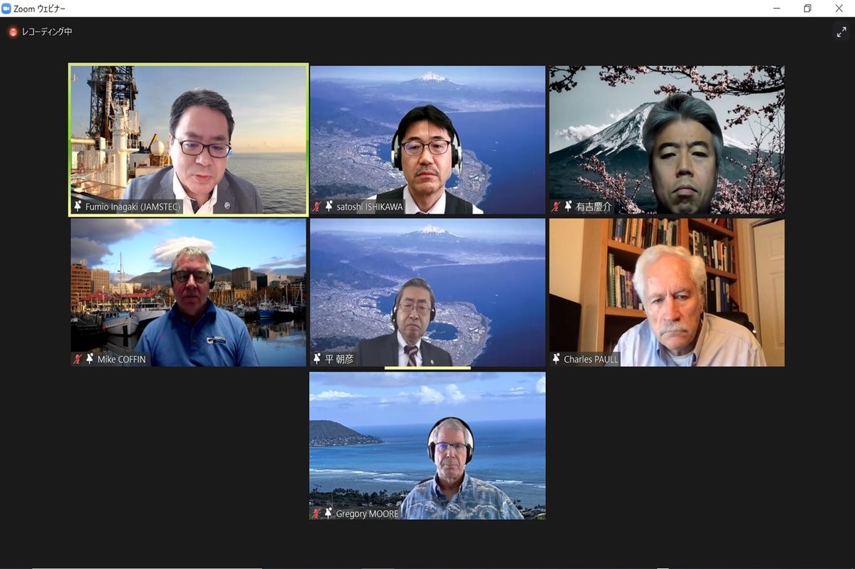 開会にあたり山田清志学長が、「コロナ禍でもこうしたセミナーを開くことができ誇らしく思います。今回は本学が取り組んできた海洋研究の事例を共有し、参加された皆さまの研究に成果をもたらす有意なものとなることを期待しています」とあいさつ。ワークショップでは6名の研究者がそれぞれの専門領域と成果について発表し、本学からは海洋研究所の平朝彦所長が「New Challenges for Seafloor Observatories」と題して講演しました。日本列島近郊の3つのプレートや南海トラフの海底地形を図で示し、昨年度まで理事長を務めていた海洋研究開発機構(JAMSTEC)での研究成果を紹介。「新たな研究への挑戦に向け、これまで以上に国際協力を発展させていきたい」と今後の展望についても語りました。また、アメリカ・モントレー湾水族館研究所のチャールズ・ポール氏、ハワイ大学のグレゴリー・ムーア氏、オーストラリア・タスマニア大学のマイク・コッフィン氏が各国における研究調査について報告。日本からはJAMSTECの有吉慶介氏と稲垣史生氏が参加し、2004年のスマトラ沖地震を機に南海トラフ周辺に設置された地震・津波観測監視システムなど先進的な研究成果を発表した後、今後の国際連携などについて議論しました。