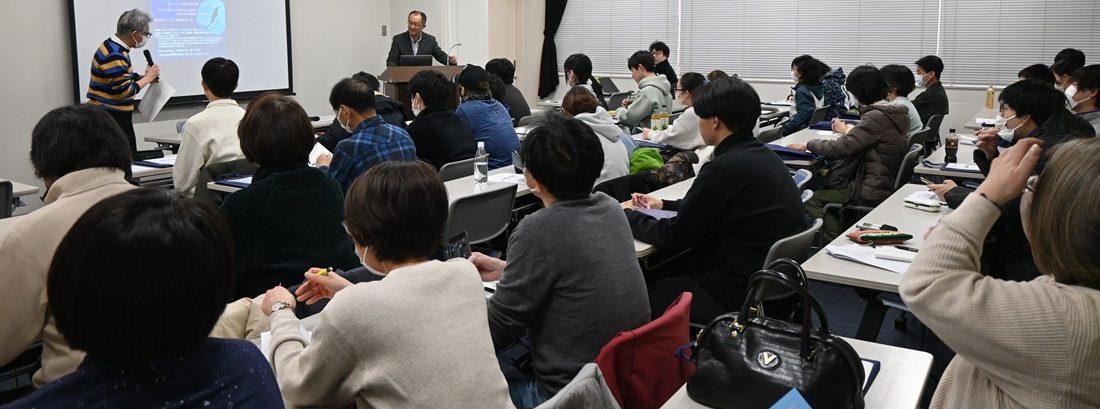 海洋学部海洋生物学科ではJR静岡駅ビル「パルシェ」で、3月8日にシンポジウム「海洋生物の素顔」を開催しました。本学科の教育・研究成果を広く社会に還元するとともに、地域の方々に海洋生物に関する知識を深めていただき、その保全や共存の道を探る契機にすることが目的です。今回は、クラゲやマグロ、クジラ、イルカといったなじみのある海洋生物の知られざる生態をはじめ、採取した海水からその海域に生息する生物の種類やおおよその生物量を把握する「環境DNA技術」に関する研究などについて、本学科の教員4名が解説しました。