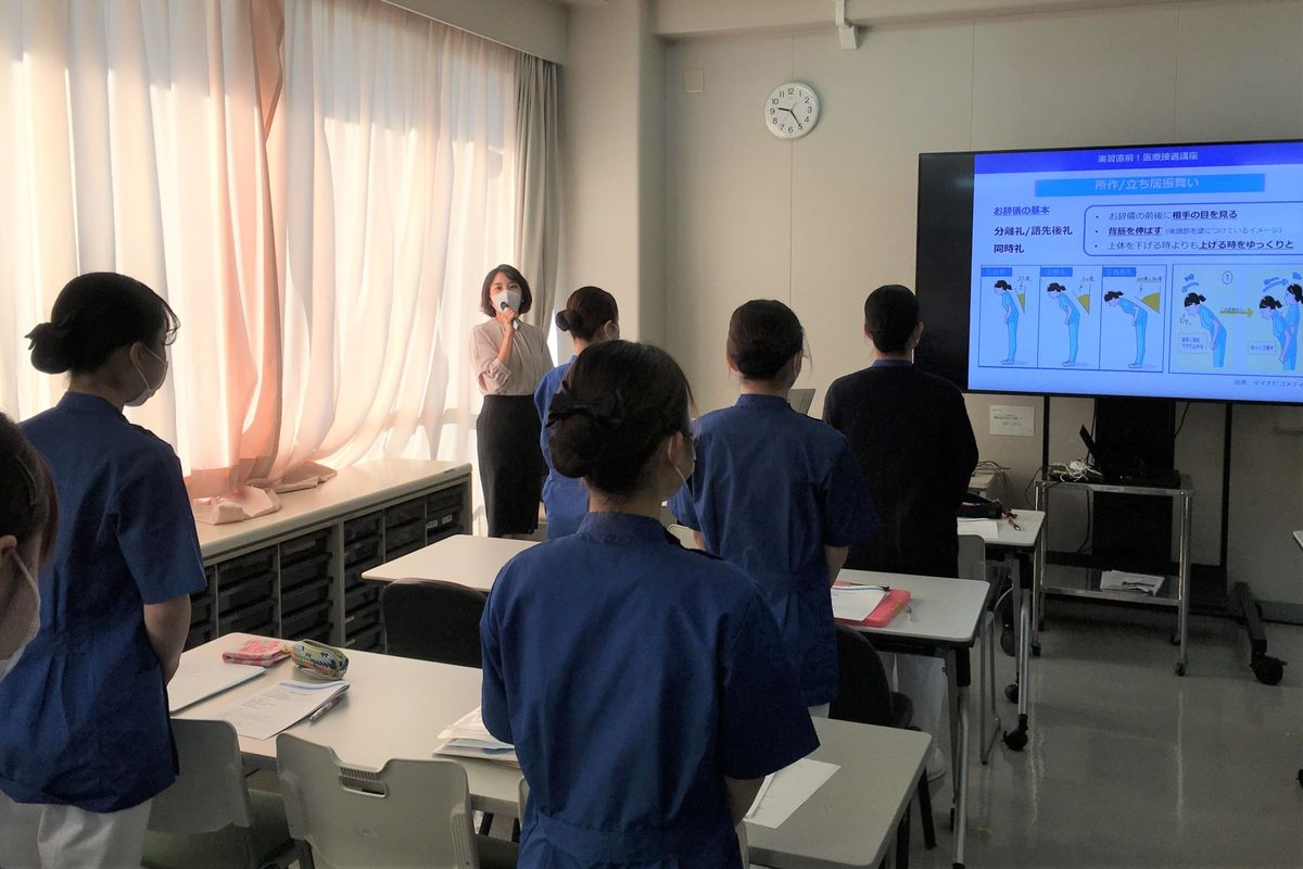 学生たちは、「“制服を着れば実習生でも医療スタッフとして見られる”という言葉に身が引き締まりました。患者さんやご家族、医療従事者への尊敬や感謝の気持ちを忘れずに臨床実習に取り組みます」「笑顔や話し方だけでなく、立ち方やお辞儀仕方でも相手に伝わる印象が大きく変わることがわかりました。自然に美しい所作ができるよう、日ごろから心がけていきたい」と意欲を見せていました。