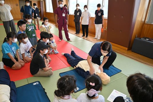 初めに医学部付属病本部本部長補佐の吉澤大教授があいさつし、付属病院の医師や看護師が救命医療の仕事やチーム医療の流れ、ドクターヘリの年間搬送件数などを解説。伊勢原警察署と伊勢原市消防本部の署員がそれぞれの仕事内容を紹介しました。続いて子どもたちが3グループに分かれ、キャンパス内で多彩な企画を体験。「BLS・ファーストエイド体験」では、付属病院の看護師が指導して心肺蘇生訓練人形を用いた心臓マッサージやAEDの講習を行ったほか、親が腕を骨折した場合を想定し、新聞紙と三角巾で固定する応急処置方法に取り組みました。「警察車両・消防車両見学」では伊勢原警察署と伊勢原市消防本部の車両が3号館前に登場。はしご車やパトカーに試乗し、消防士や警察官に仕事内容について質問する場面も見られました。また、「ドクターヘリ・ドクターカー見学」では病院内のヘリポートで機体を見学し、搬送方法や内部構造について学びました。