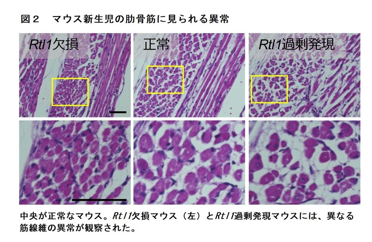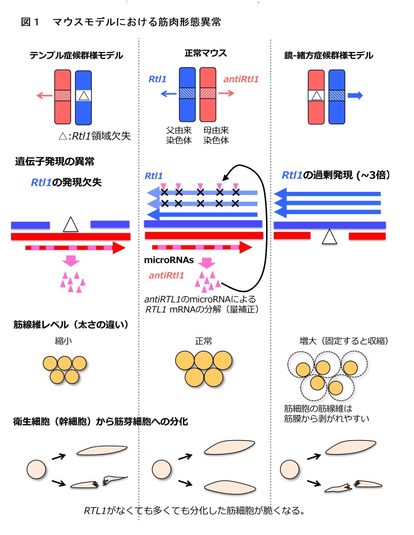 研究グループは、父親性の染色体のみから発現するRTL1遺伝子が胎児期初期から新生児期にかけて筋肉組織で発現することに注目し、「鏡-緒方症候群」の特徴的な症状である筋肉異常を発生させたモデルマウスを用いて、発症のメカニズムの解明に着手。Rtl1遺伝子が、筋肉の発生や発達に重要な役割を担うサテライト細胞(筋幹細胞)の増殖や筋芽細胞の強度に関与し、筋肉の構造維持や筋収縮制御などに重要な働きを担っていること、そして肋間筋や横隔膜、腹壁の筋線維といった呼吸に関連する筋肉の構造異常を引き起こすことを明らかにしました。