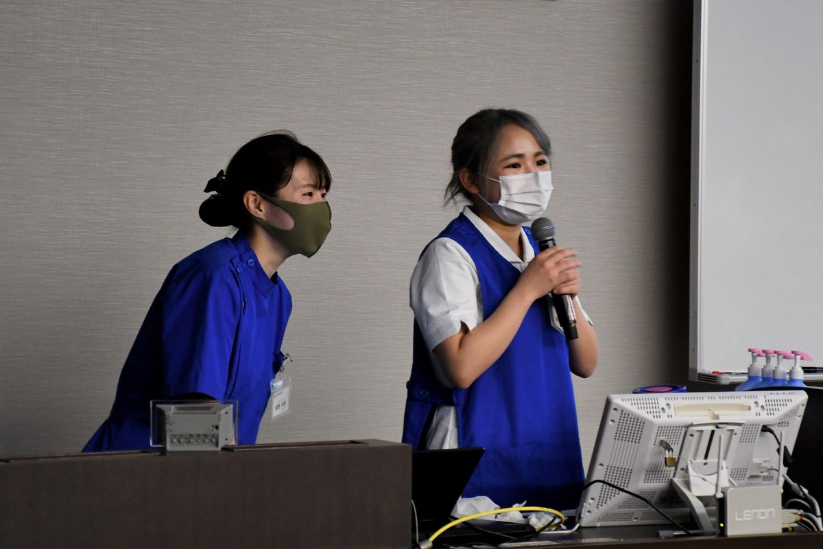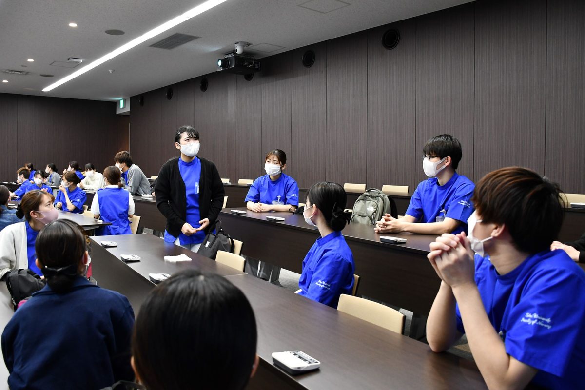 学生たちは9チームに分かれて自己紹介した後、グループ対抗で基礎看護をテーマとしたゲーム感覚のクイズに取り組み、意見を交わし合って交流を深めました。中心になって企画し、司会を務めた津村美咲さんは、「全員が顔を合わせられず、孤立しがちな学生もいることから、皆がコミュニケーションを深める機会をつくりたいと考えました。自由参加にもかかわらずほとんどの学生が集い、積極的に語り合う姿を見て、実施してよかったと思っています。これを機に、学生同士の信頼関係や団結力が高まるとうれしい」とコメント。「新型コロナの感染拡大が心配される中、私たちの思いを受け止めてサポートしてくださった先生方と職員の皆さんにも感謝しています。学生であっても“医療従事者の一員”という意識を持って感染防止に努め、仲間と協力しながら勉学に励みたい」と意欲を見せていました。