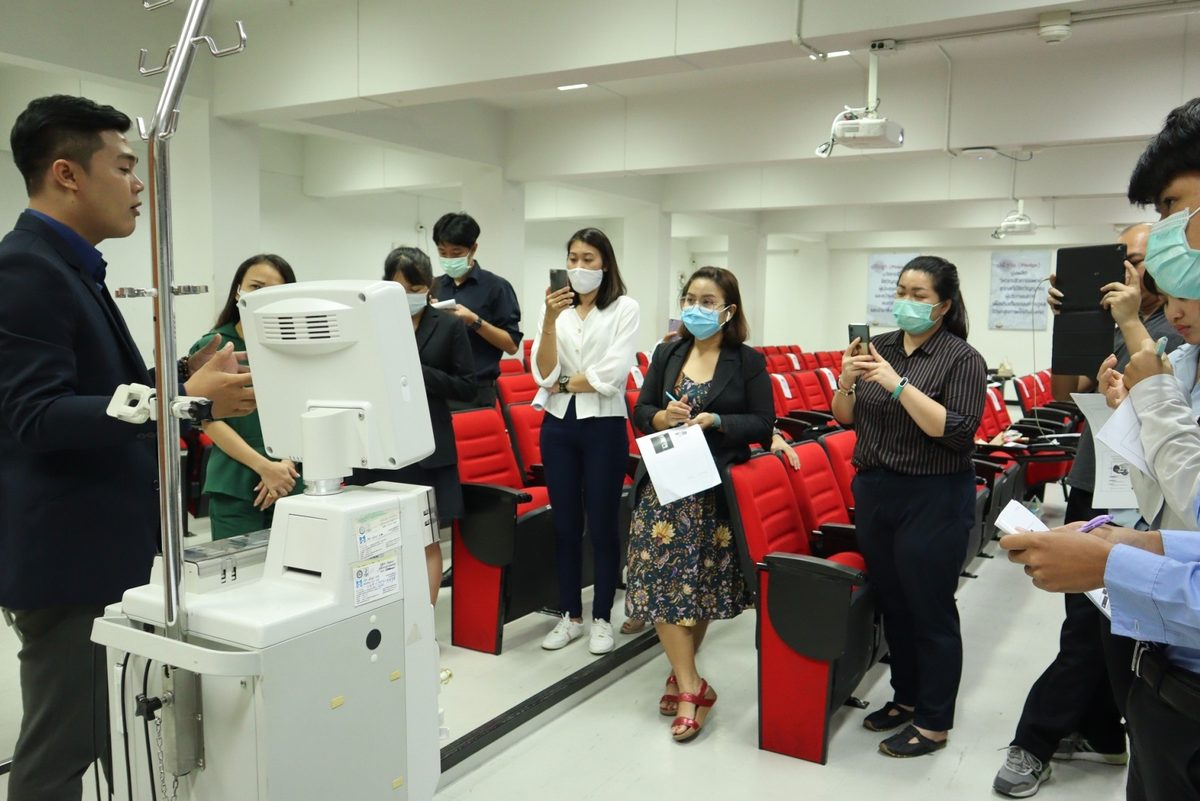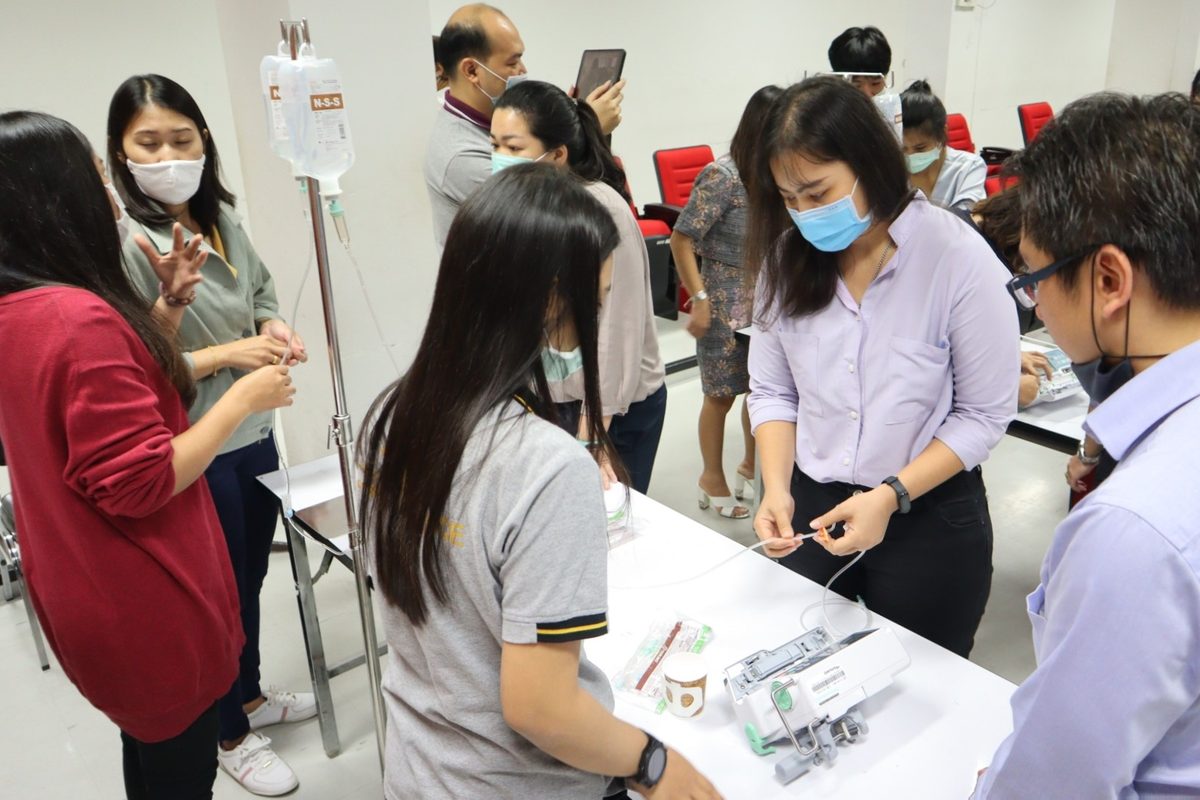 研修では、CEが体外式膜型人工肺(ECMO)や人工呼吸器、血液浄化装置、薬剤を投与するための輸液ポンプ、シリンジポンプの構造や保守管理方法について講義し、医療機器メーカーの技術者が実機を用いて使用方法を解説。重度の呼吸器疾患の治療に欠かせないECMOについては、臨床現場で使われている様子をVRで体験してもらったほか、日本におけるECMO治療を牽引している済生会宇都宮病院救急・集中治療科の小倉崇以医師を招いての特別講演を行いました。また、輸液ポンプとシリンジポンプについては、タイにある医療機器メーカーの支店の協力を得て、ランシット大学に実機を持ち込んでの操作実習も実施。さらに、CEが日本の臨床工学技士制度の変遷や多職種連携医療の重要性について講義しました。