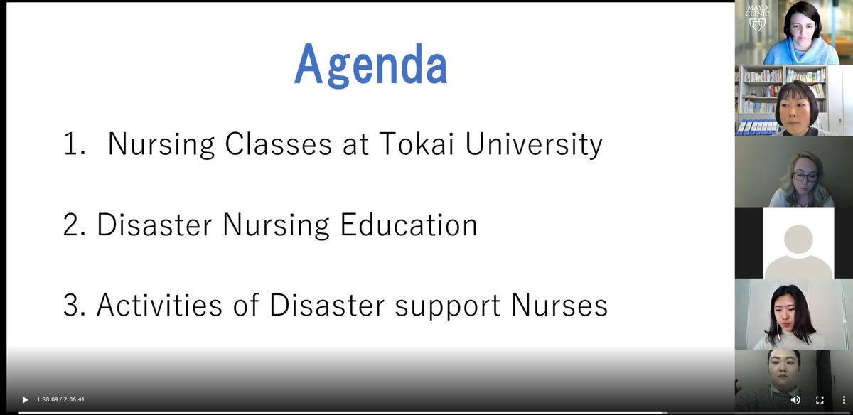 前半はメイヨクリニックの看護師が看護部の概要を説明し、映像で病院内を案内。同クリニックで実習しているルーサーカレッジの看護学生は、大学施設やコロナ禍での授業、キャンパスライフについて映像とともに紹介しました。後半は、医学部付属大磯病院の後藤大輔看護主任が、COVID-19患者専用病棟の管理者としての体験を報告。参加者が医療スタッフの教育やサポート、地域連携などについて意見を交わしました。「国際看護基礎演習B:メイヨ」を履修している本学科3年次生の遠藤春奈さんと千葉茜音さんも、東海大学の特徴や看護学科のカリキュラム、日本の災害支援看護について英語でプレゼンテーションしました。