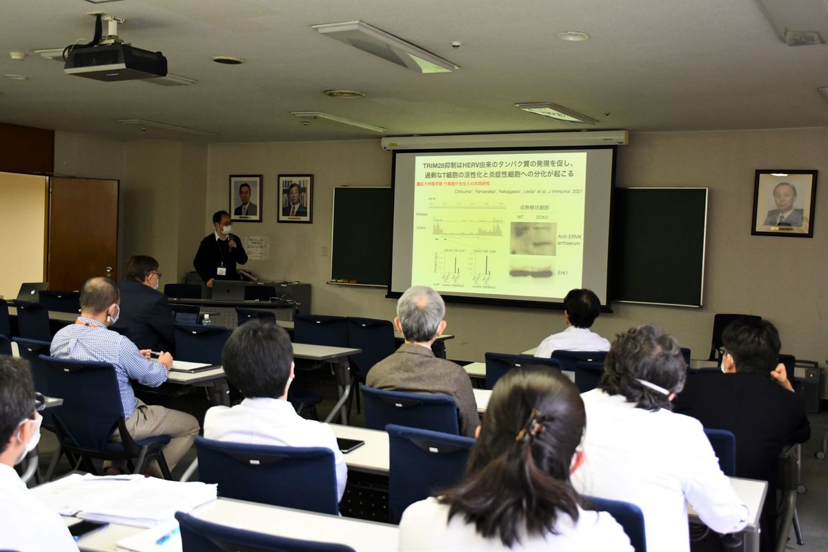 報告会では、初めに本研究所の安藤潔所長(医学部医学科内科学系血液・腫瘍内科学教授)が登壇。「コロナ禍でさまざまな制約がある中、皆さんの努力により順調に研究が進んだことをうれしく思っています。ぜひ活発なディスカッションをお願いします」とあいさつしました。続いて、特別研究員制度により登用された若手研究者3名と今年度のコアプロジェクトを推進する研究者1名、特に顕著な進展があった研究者2名が最新の成果についてプレゼンテーションし、今後の展開や臨床への応用などについて参加者と意見を交わしました。