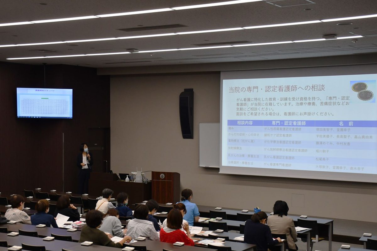 後半は、本病院「がん看護コアナース会」に所属するがん看護専門看護師の大塚敦子主任が、「がんの治療と暮らしの工夫」と題して、医師との面談や手術・薬物・放射線治療の際に気を付けるべき点について説明。本病院のがん相談支援センターや、がん患者に対するケアを専門とする専門看護師、認定看護師の役割も紹介し、「一人ひとりの患者さんにとって最適な治療を目指すとともに、がんになっても自分らしく暮らしていただけるよう、医療チームが支援していきます」と結びました。終了後には乳がんの触診体験コーナーを設け、健診センターの看護師らが触診モデルを使って、参加者に自己触診の方法を説明しました。