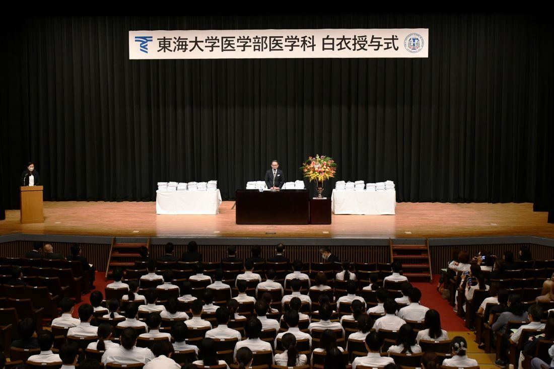 医学部医学科では9月26日に伊勢原市民文化会館で、4年次生を対象とした白衣授与式を行いました。診療に必要な知識や患者に接する態度、診察の仕方などの修得度を評価する共用試験に合格し、臨床実習生として医療機関で基礎臨床実習やクリニカルクラークシップ(診療参加型臨床実習)に臨む110名が、プロフェッショナリズムに則した行動や守秘義務の順守を誓約。大上研二医学部長や渡辺雅彦医学部付属病院長、医学科同窓会である星医会の谷口佳浩会長らが激励し、白衣を授与しました。