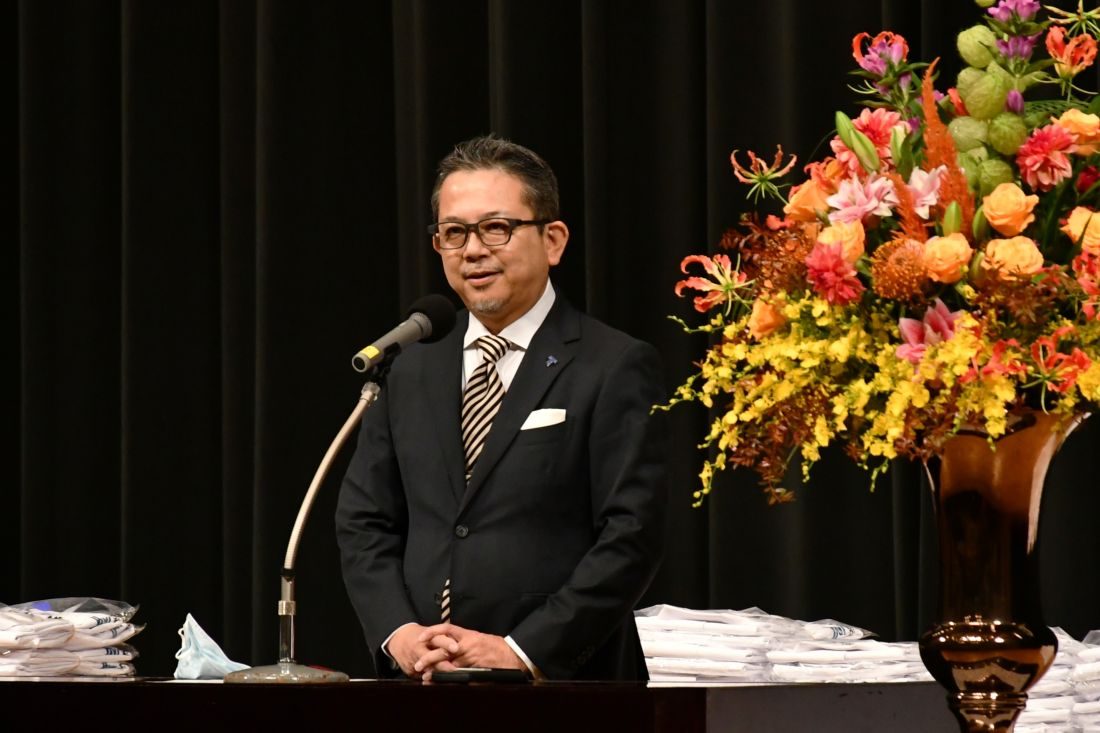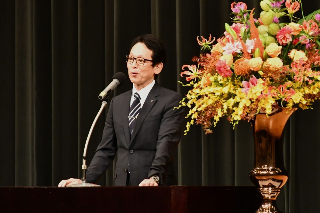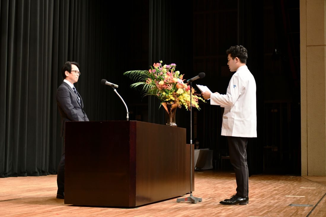 続いて、学生を代表して桐山智樹さんが、「臨床実習が、多くの患者様とそのご家族のご理解とご協力があって成り立つものであることを深く理解するとともに、指導してくださる方々への感謝を忘れず、貴重な機会を最大限に活用できるよう誠心誠意努力します」と決意を表明。最後に竹下学科長が、「皆さんが目の前にいる患者さん一人ひとりの“希望の星”に成長するよう心から願っています」と期待を語り、閉会の言葉を述べました。