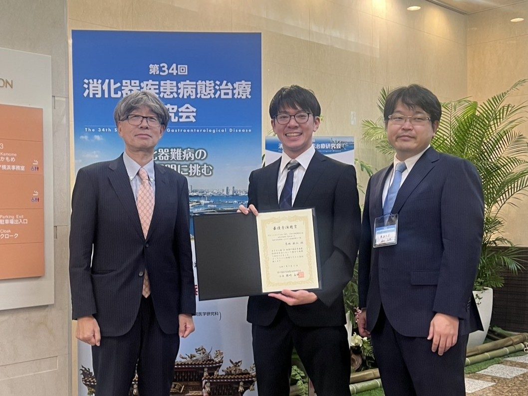 医学部付属病院消化器内科の菊地毅弘医師が、9月12日、13日に横浜市で開催された第34回消化器疾患病態治療研究会「研修医・専攻医アワード」セッションで「OTSC (Over The Scope Clip)システムで止血し得た、3回の内視鏡治療的止血、血管塞栓後に再出血した経鼻胃管接触による十二指腸潰瘍の1例」という題名で症例を発表。「最優秀演題賞」を受賞しました。